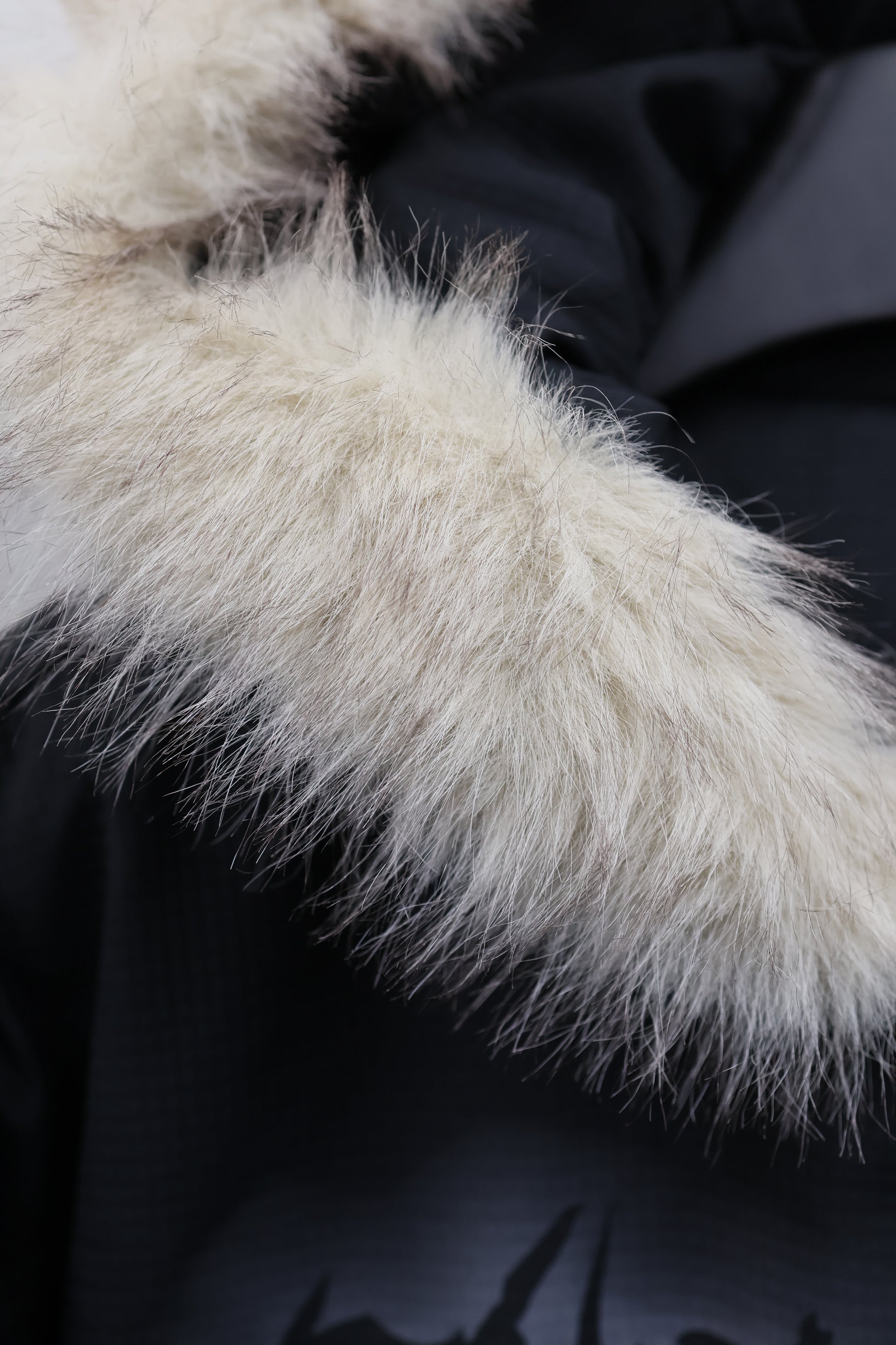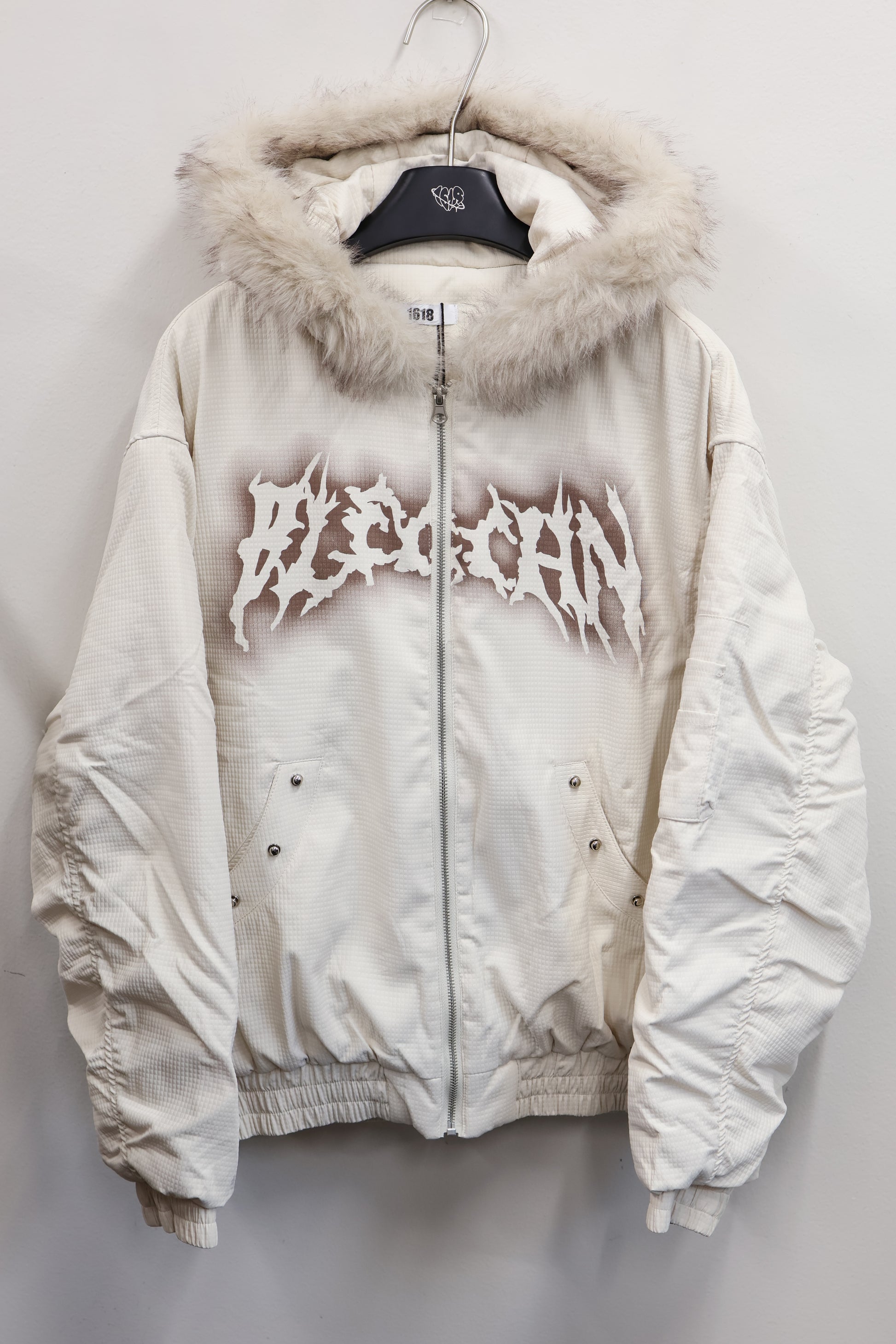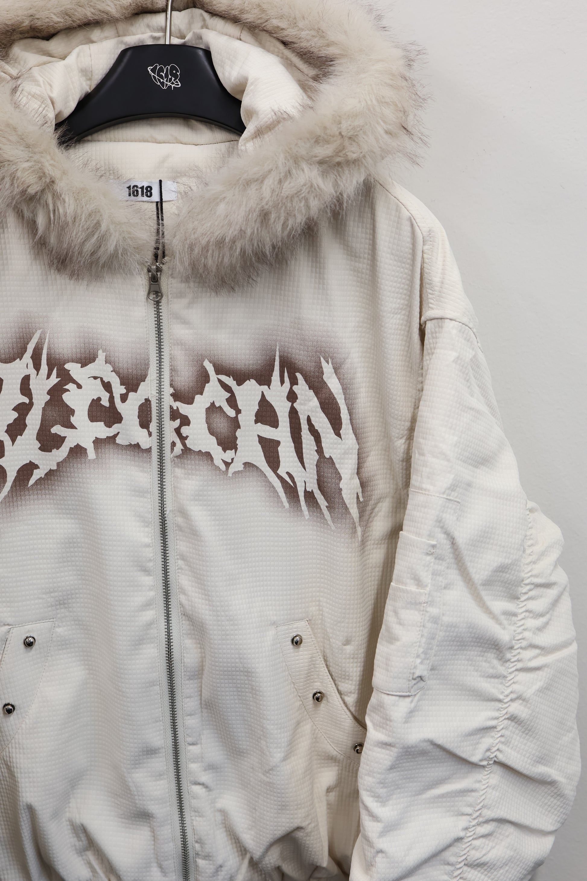 フードにたっぷり載せたボリュームファー×胸元のスプレーグラフィックが、1618らしいストリート強めの雰囲気をまとった一着。