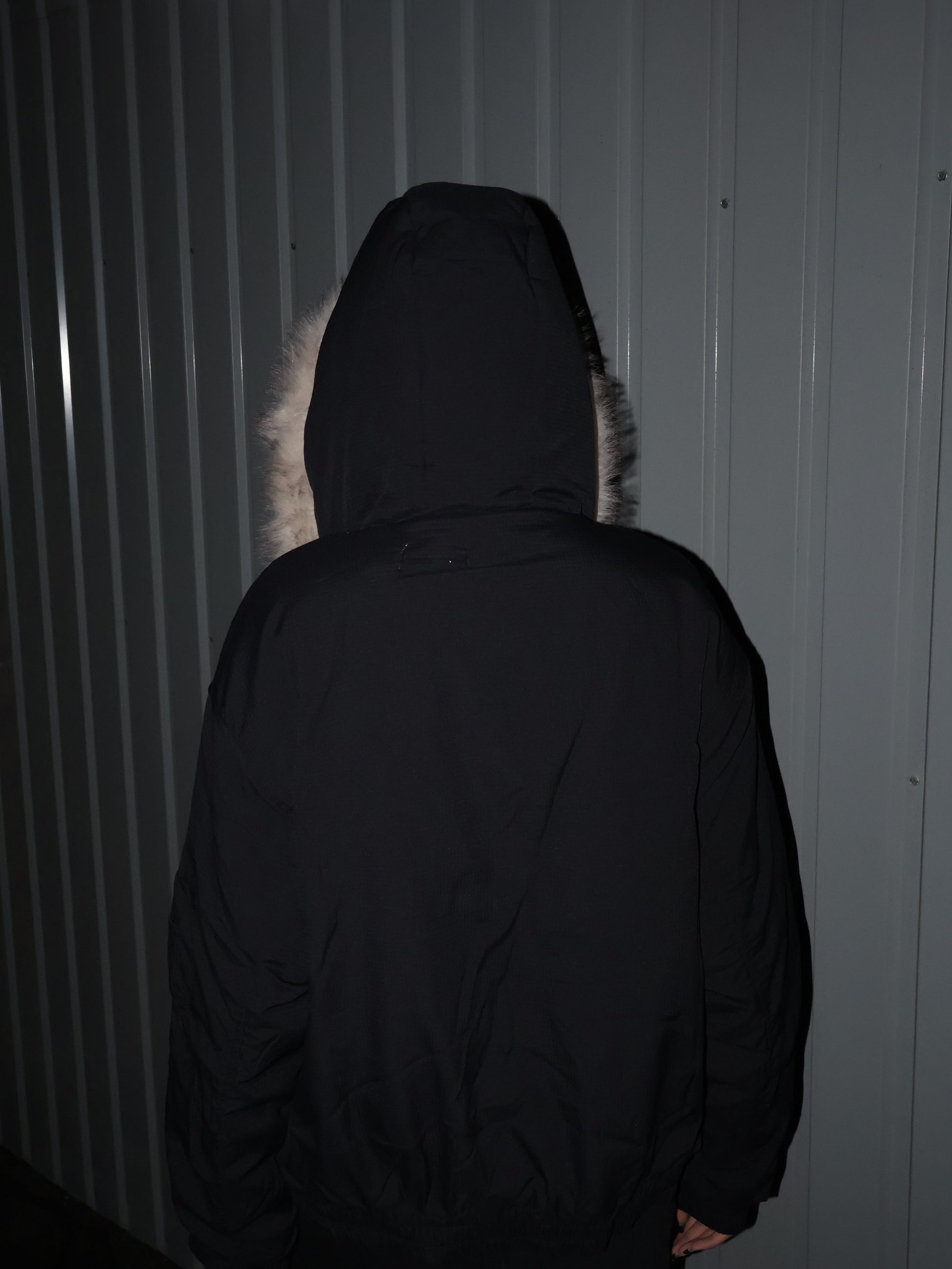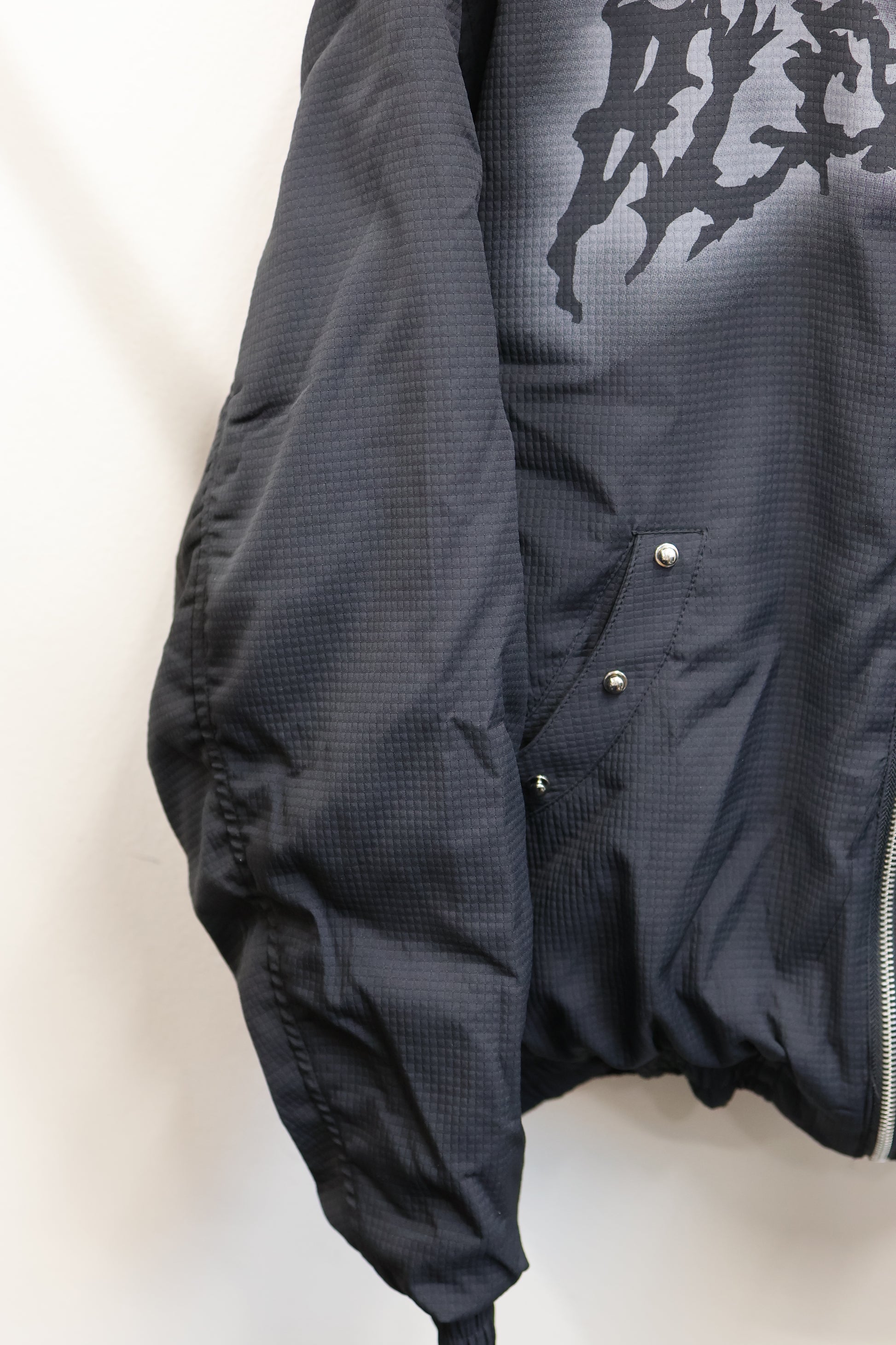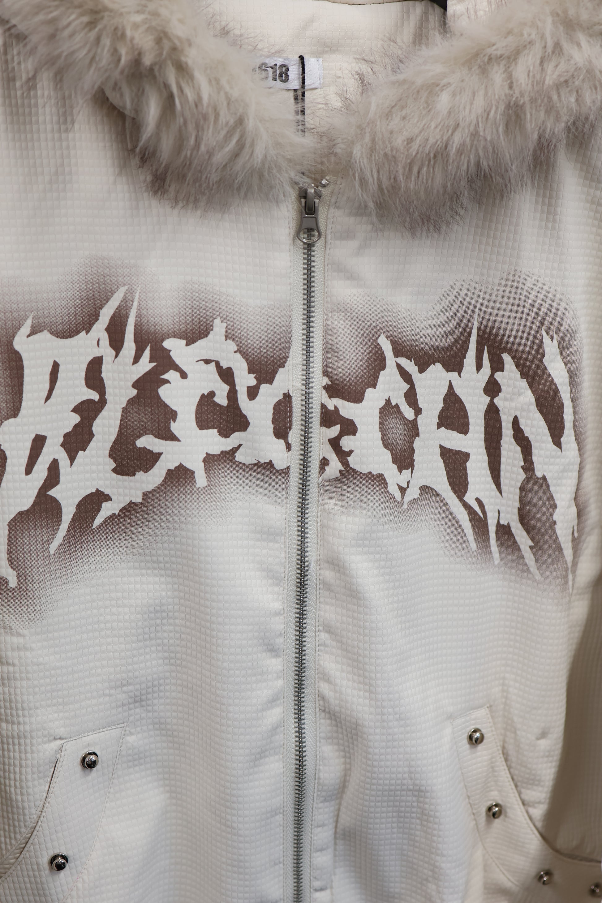 フードにたっぷり載せたボリュームファー×胸元のスプレーグラフィックが、1618らしいストリート強めの雰囲気をまとった一着。