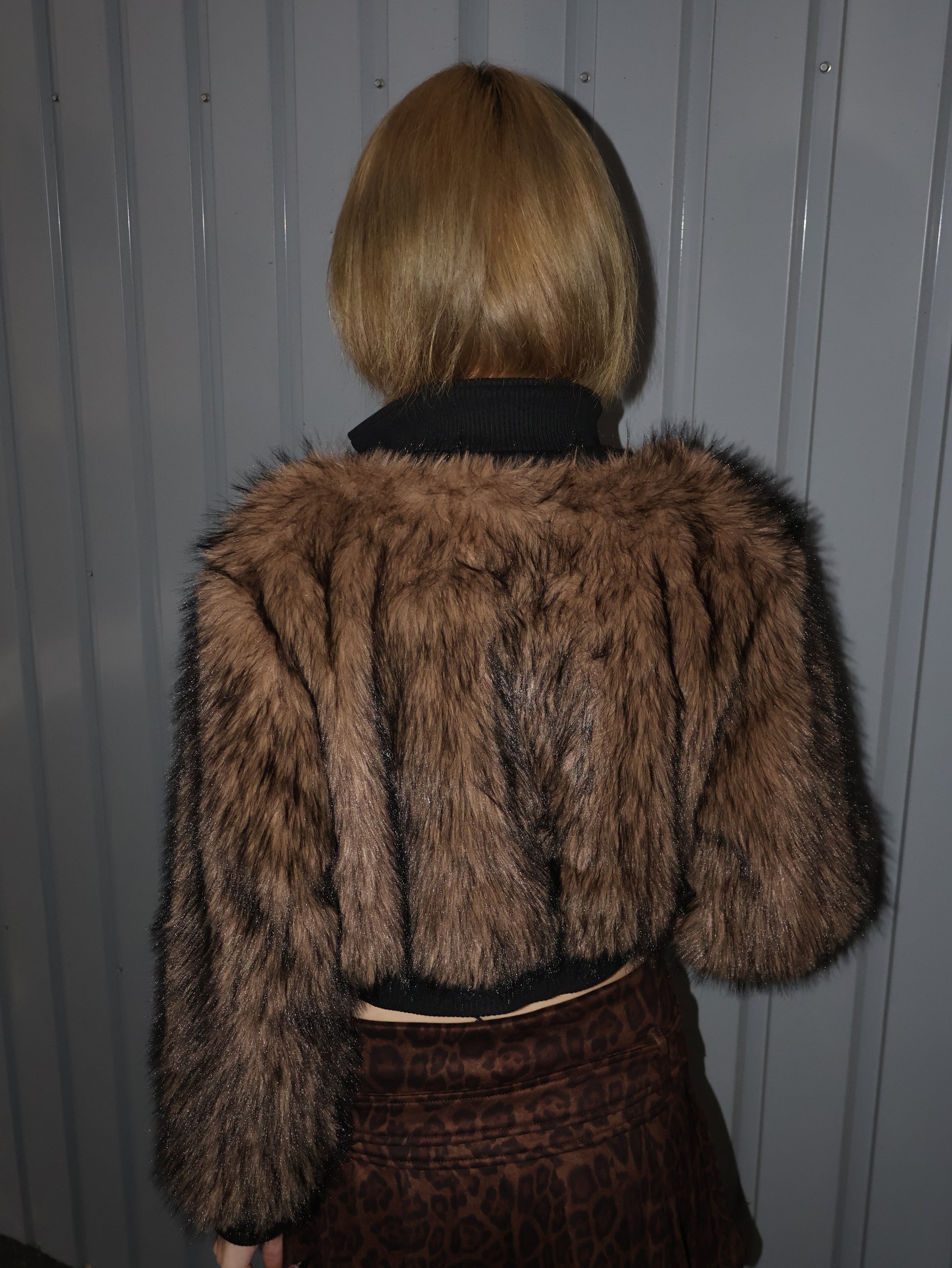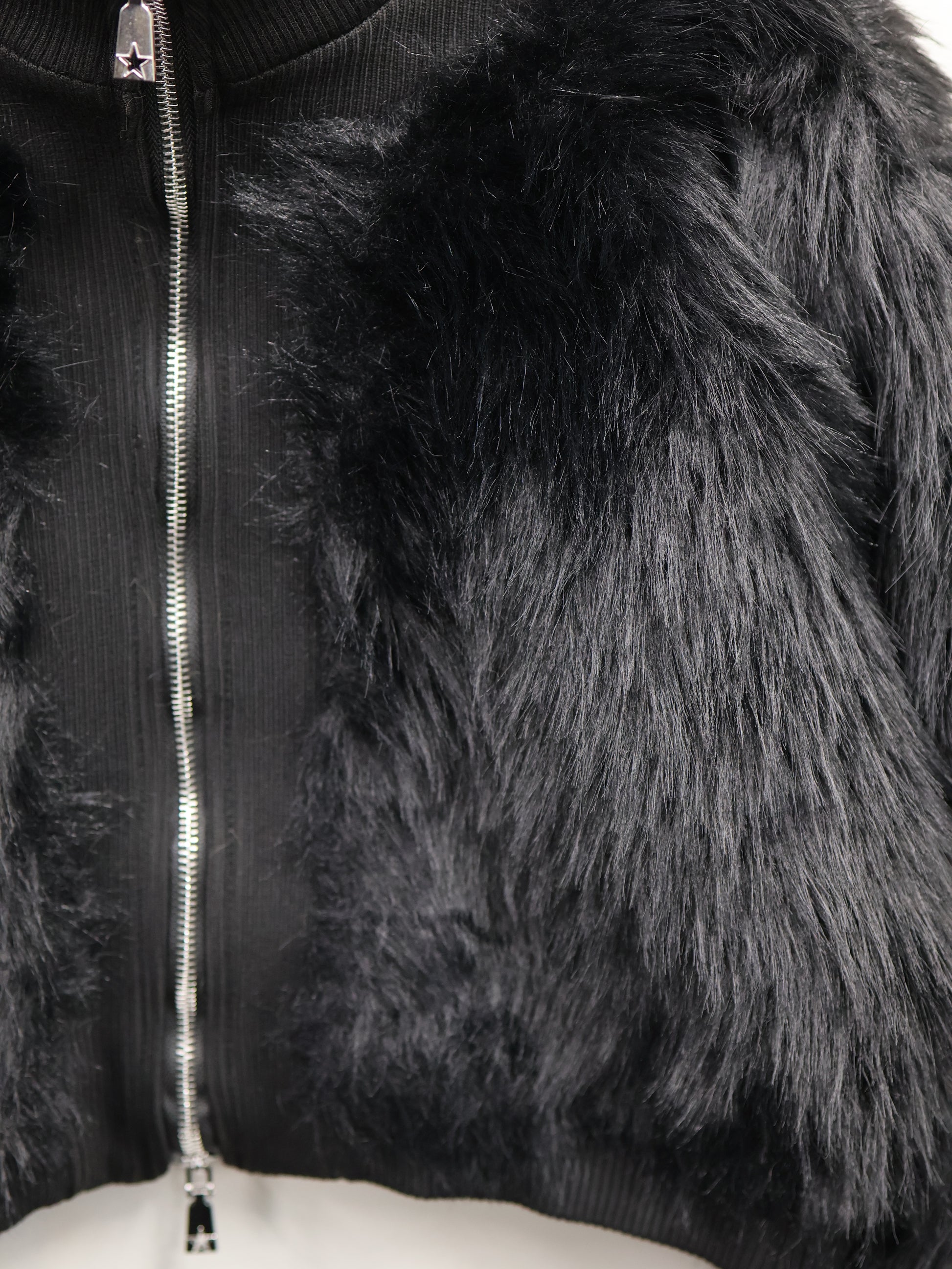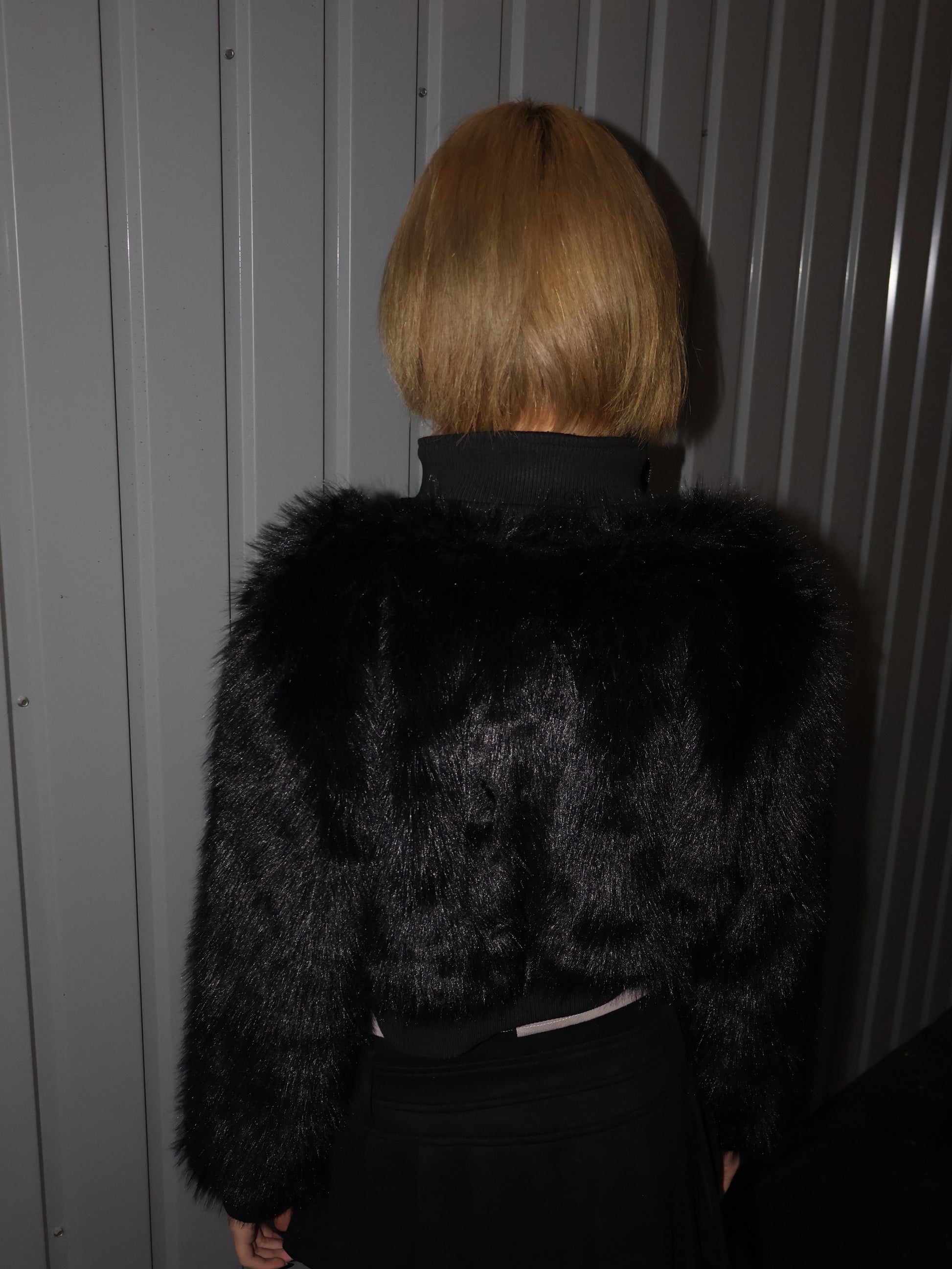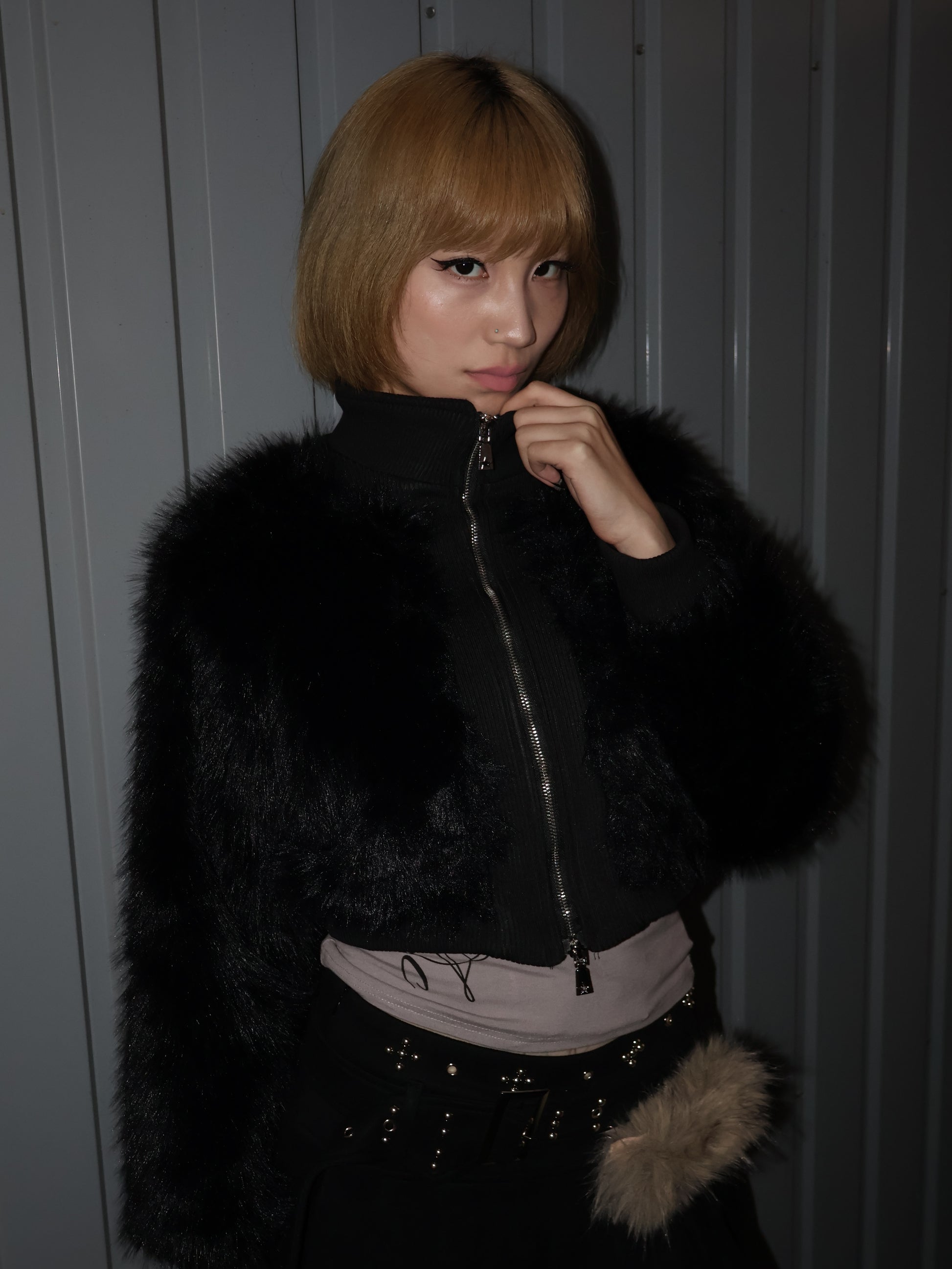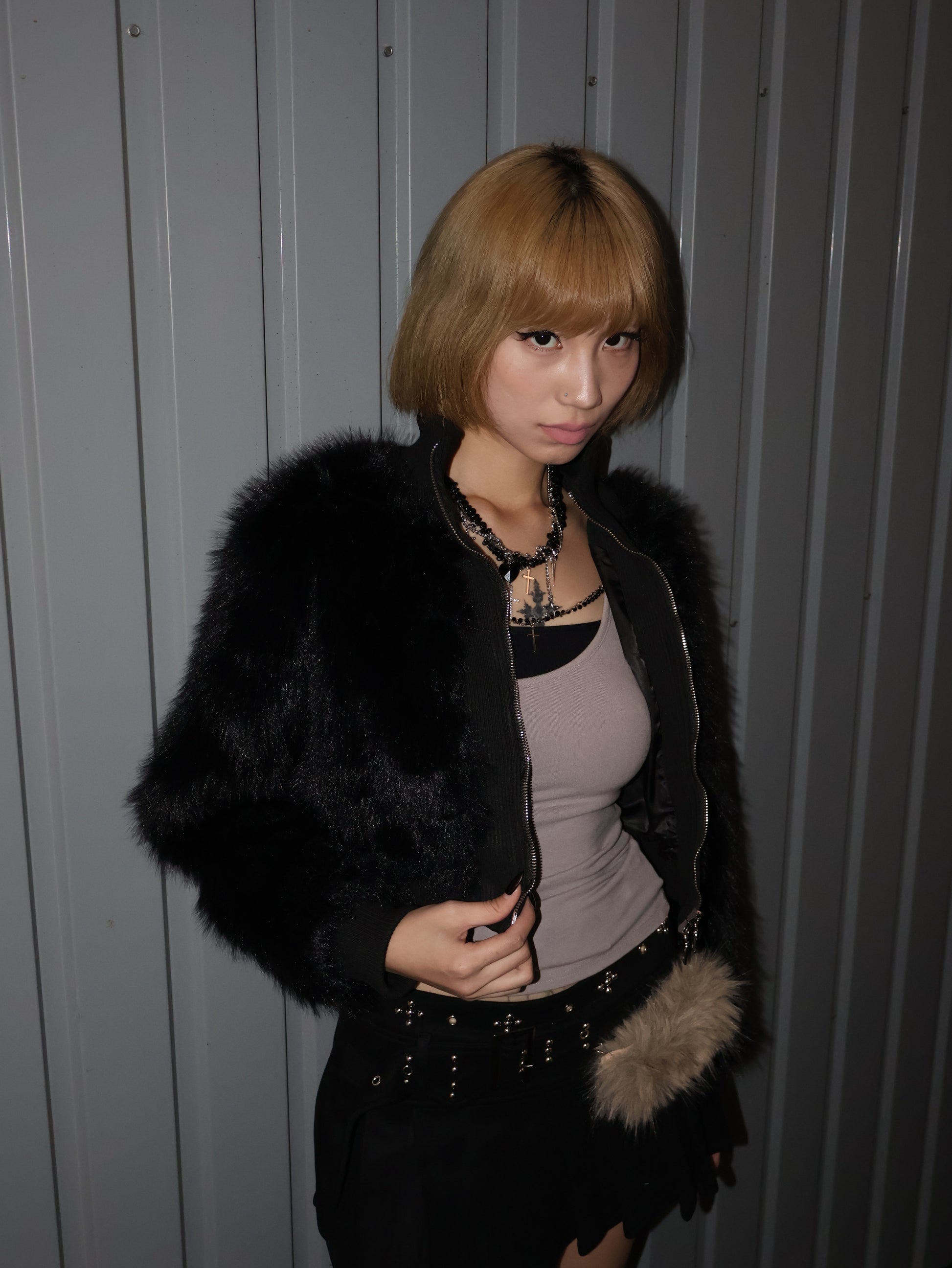 ボリュームたっぷりのフェイクファー×クロップド丈で、羽織るだけで盛れる主役アウター。Y2K・韓スト・平成ギャルどれにもドンピシャでハマるシルエット。短丈だからバランスが取りやすく、どんなボトムでも脚長に見せてくれる強めデザイン。スト系の黒アイテムとの相性も抜群で、冬コーデの“レベチ感”を一気に引き上げてくれる1枚。
