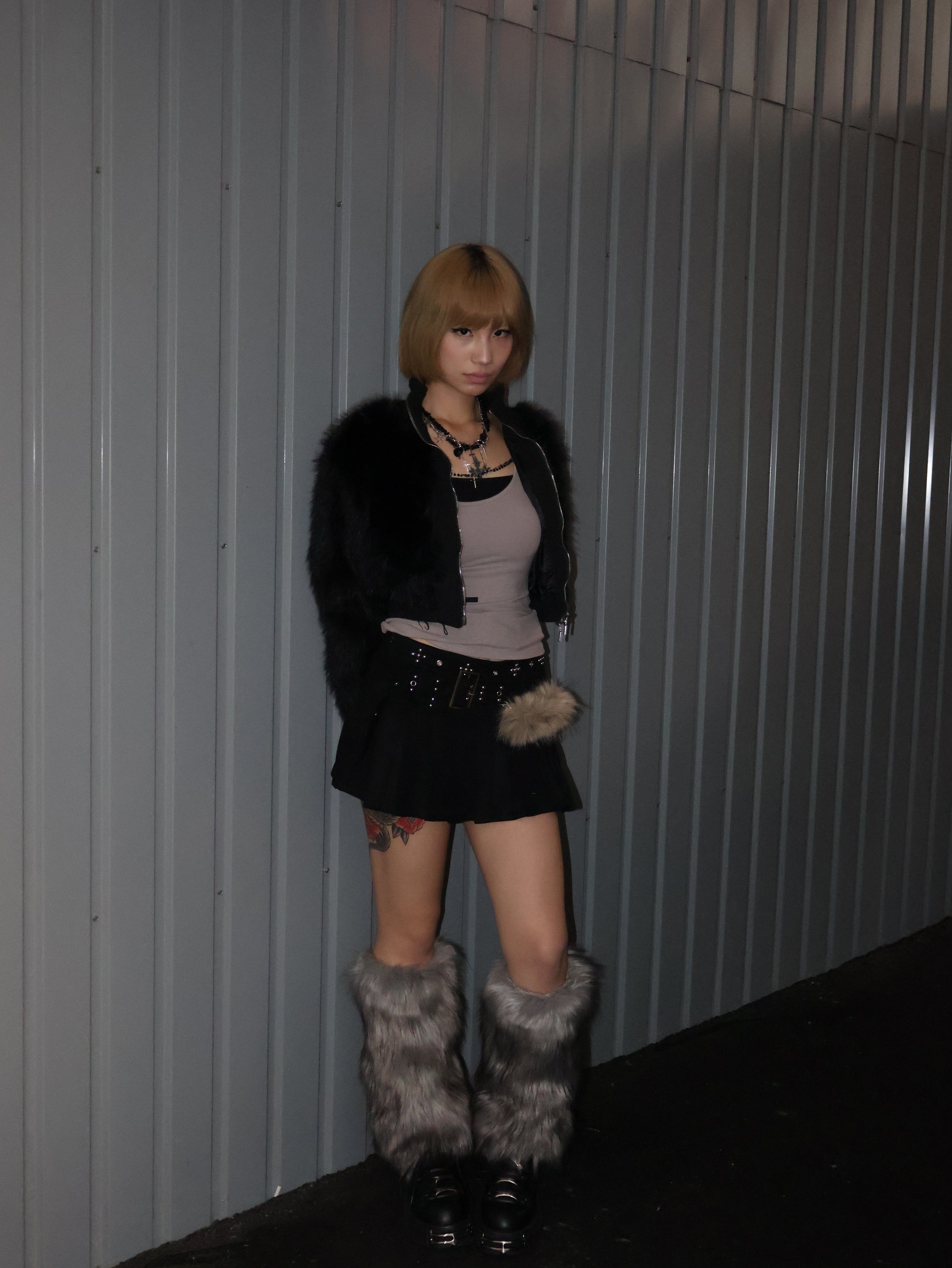 → 腰位置が高く見えるクロップド丈で脚長効果が強い。ファーのボリュームでヘッドバランスも綺麗にまとまり、Y2Kらしい“強めシルエット”が完成。