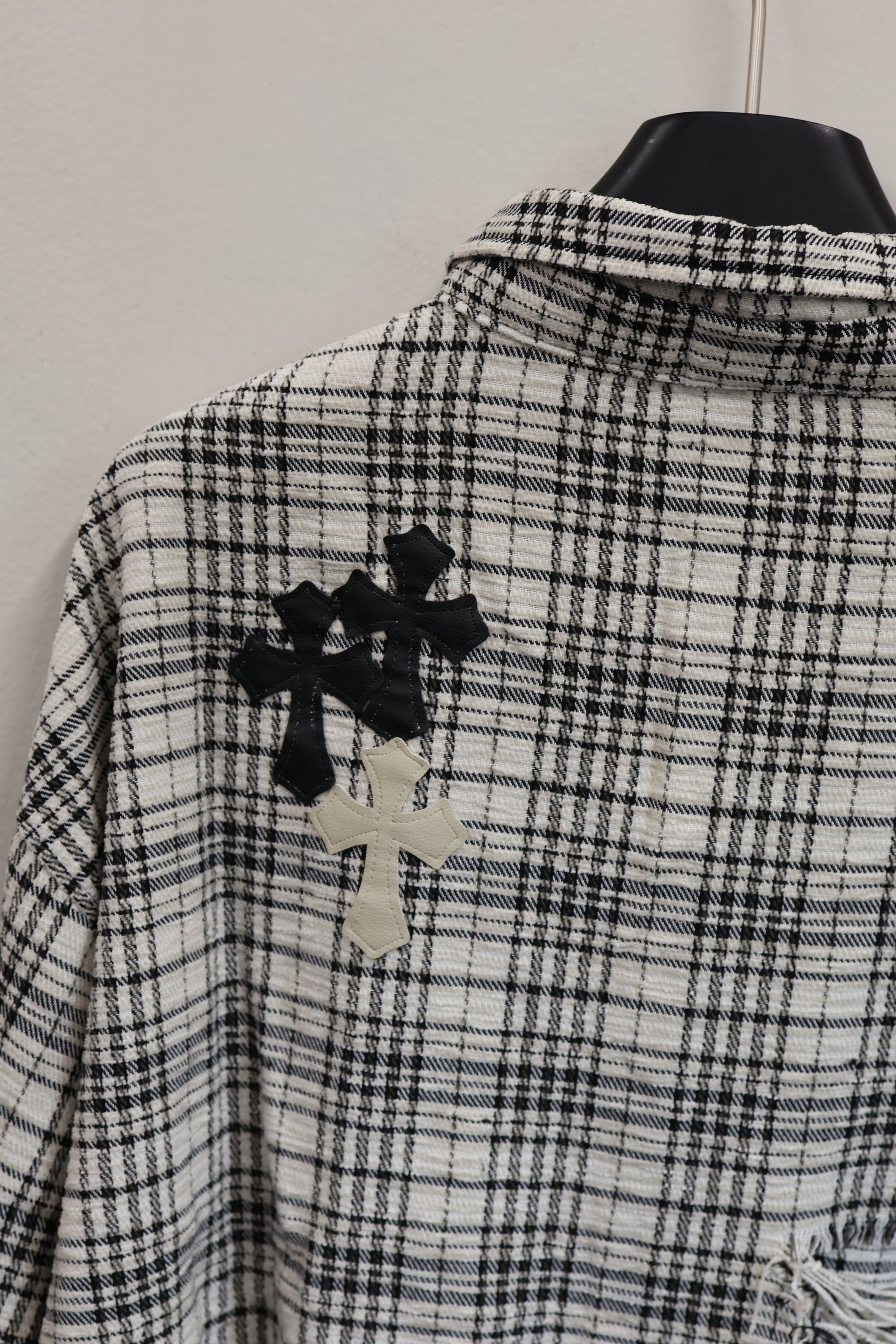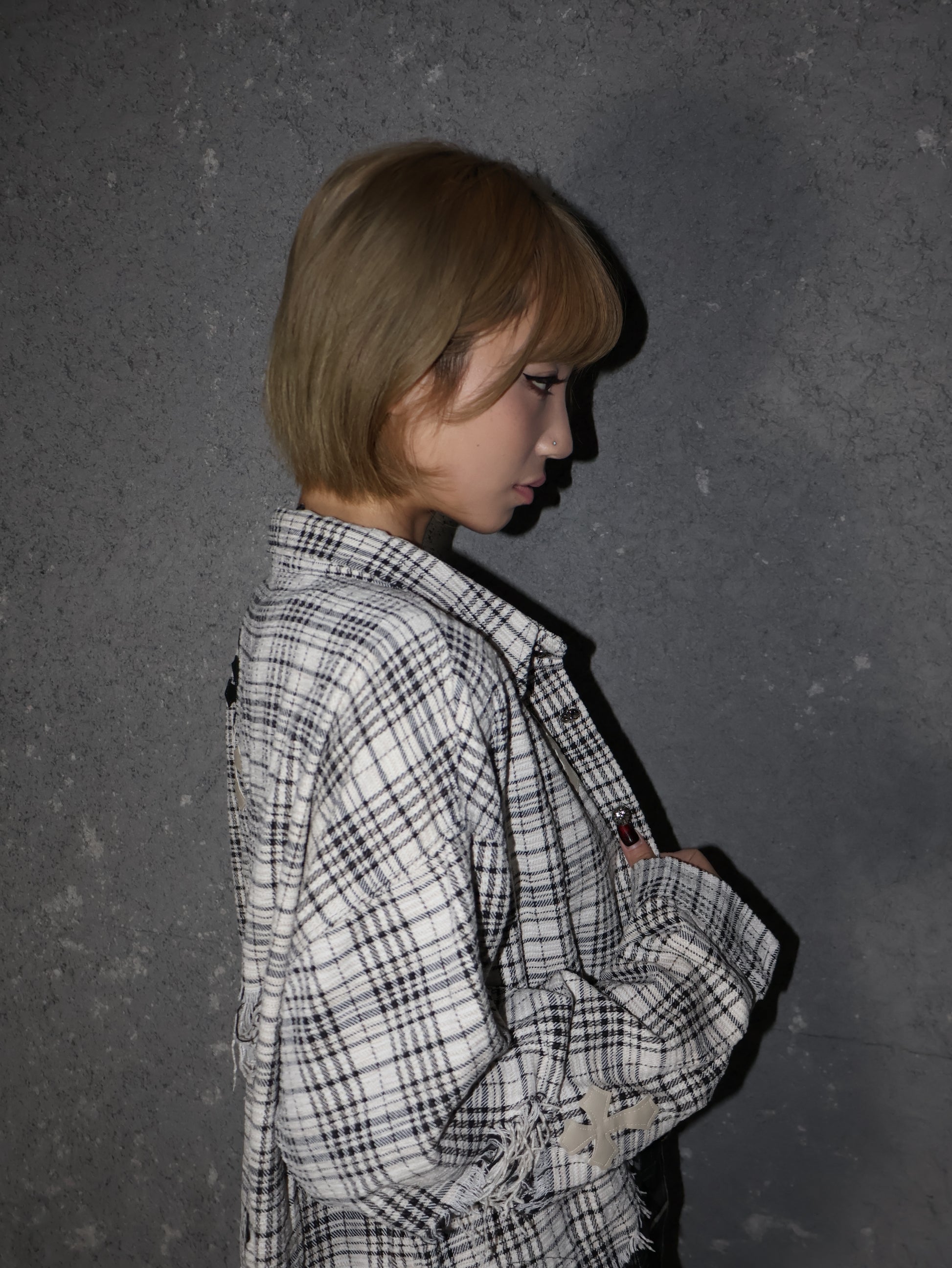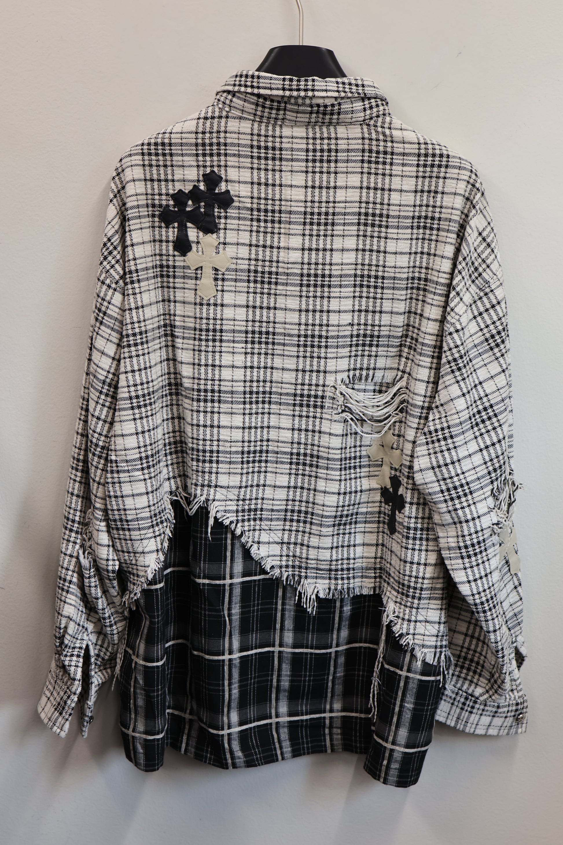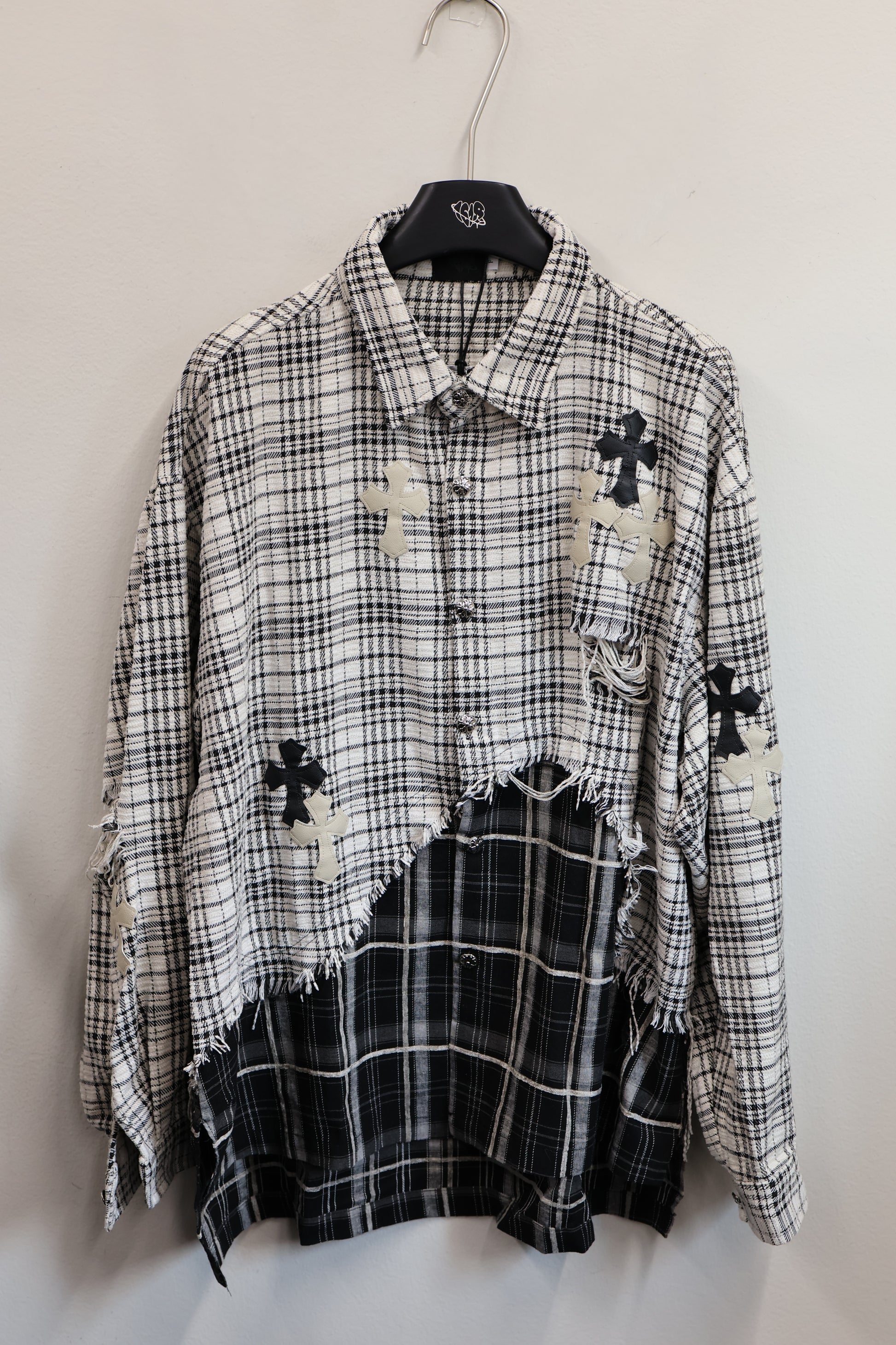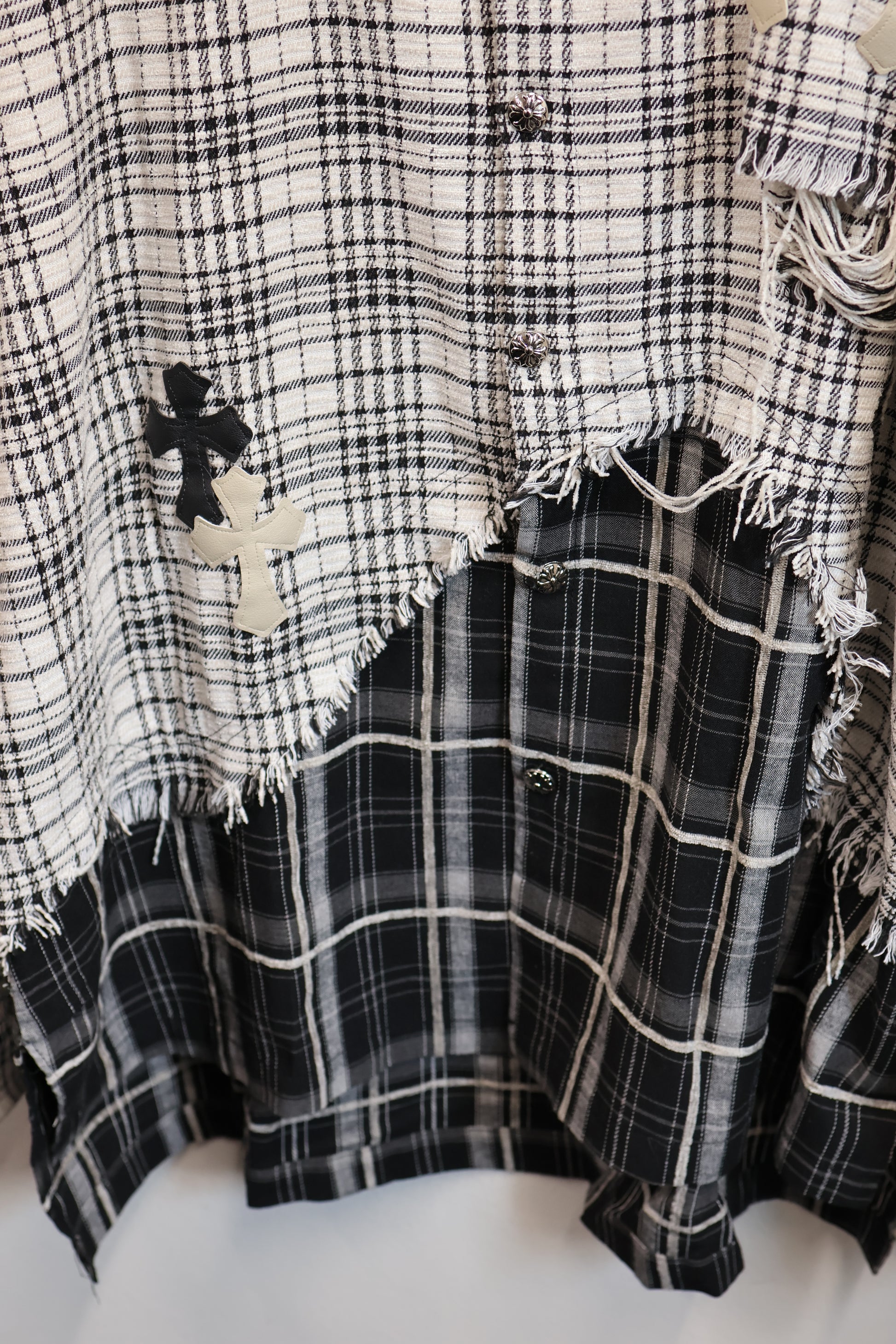 モノトーンの細チェック×太チェックを組み合わせた、1618らしいクセ強めのリメイク風シャツ。