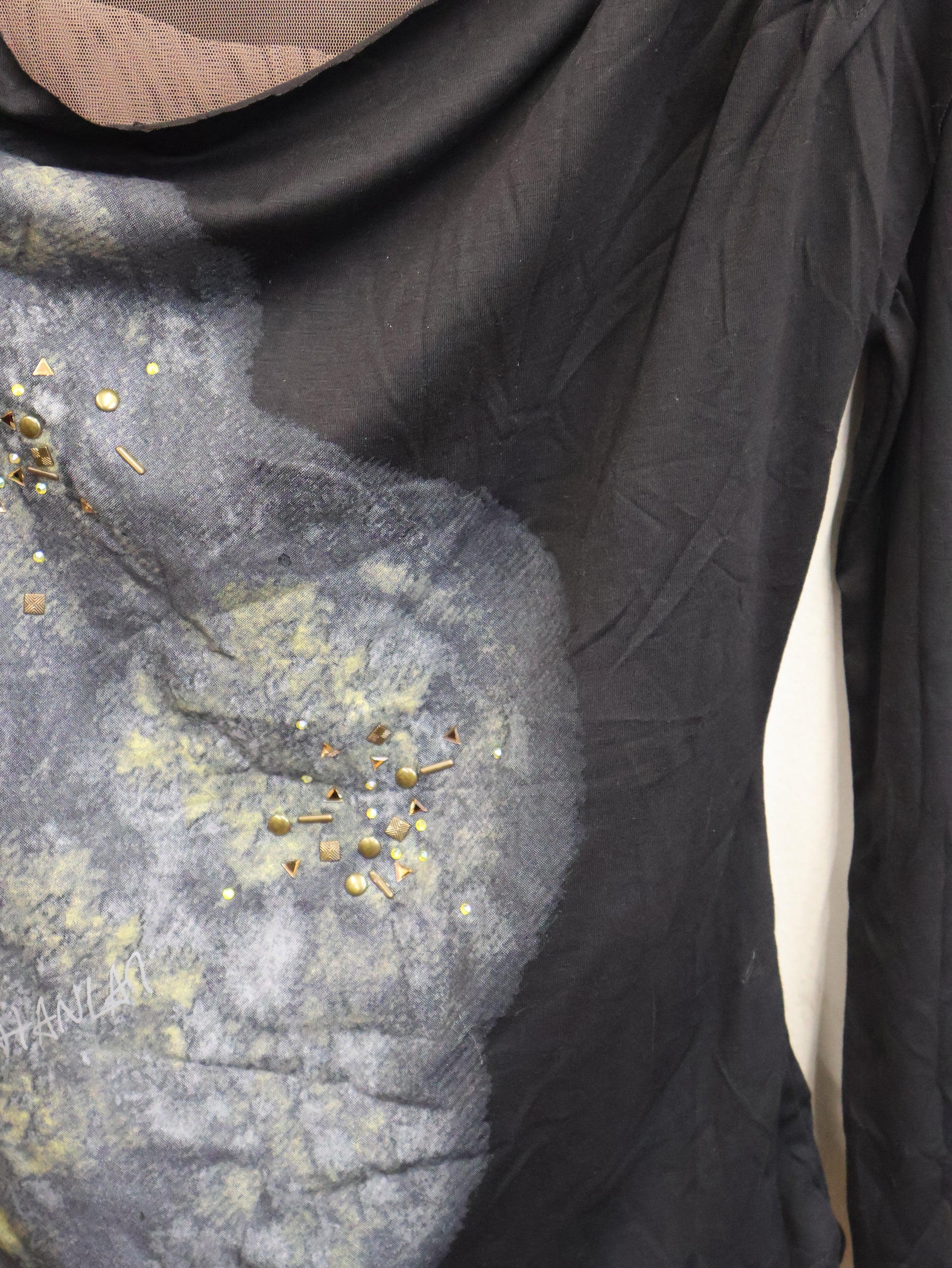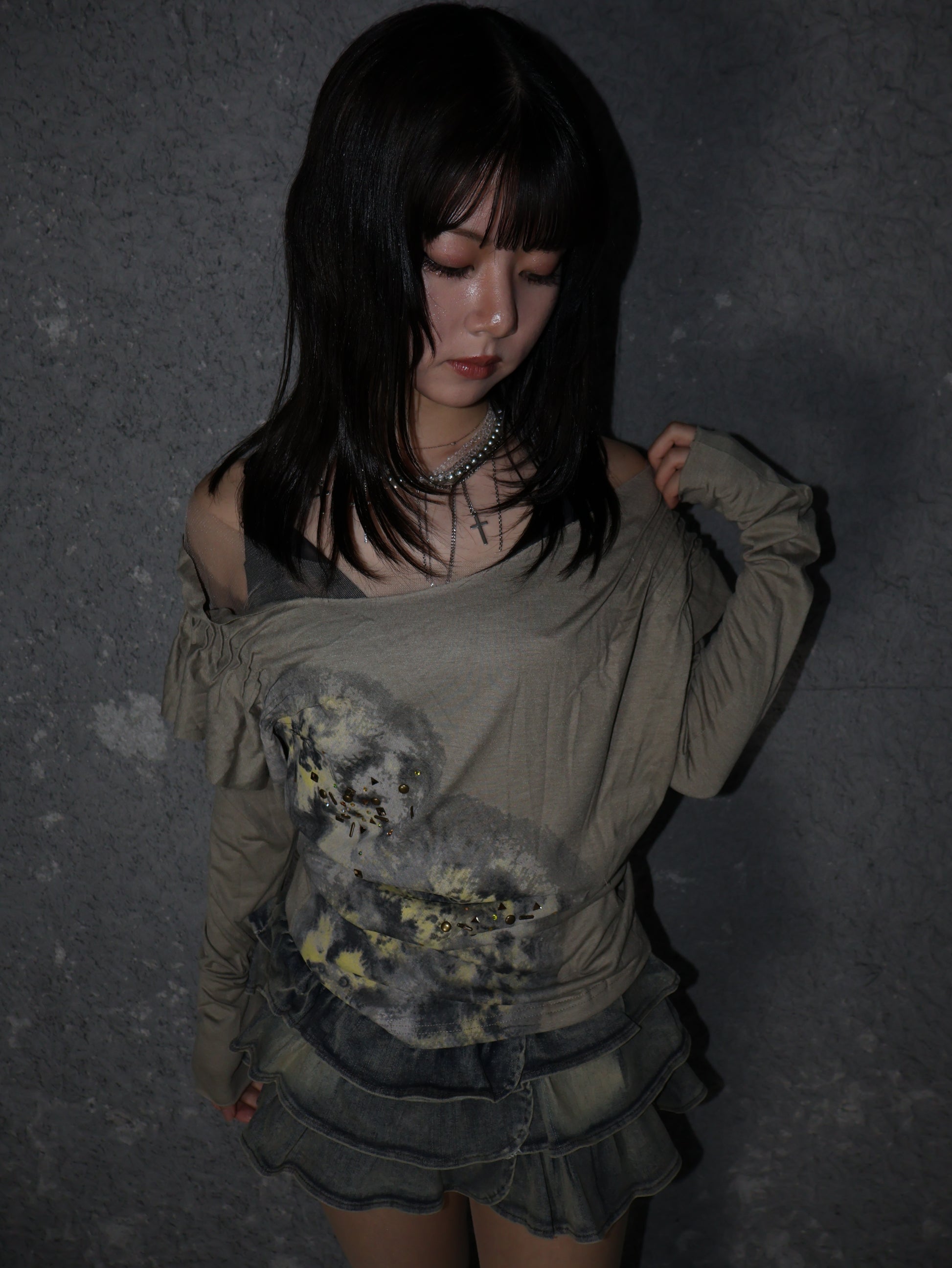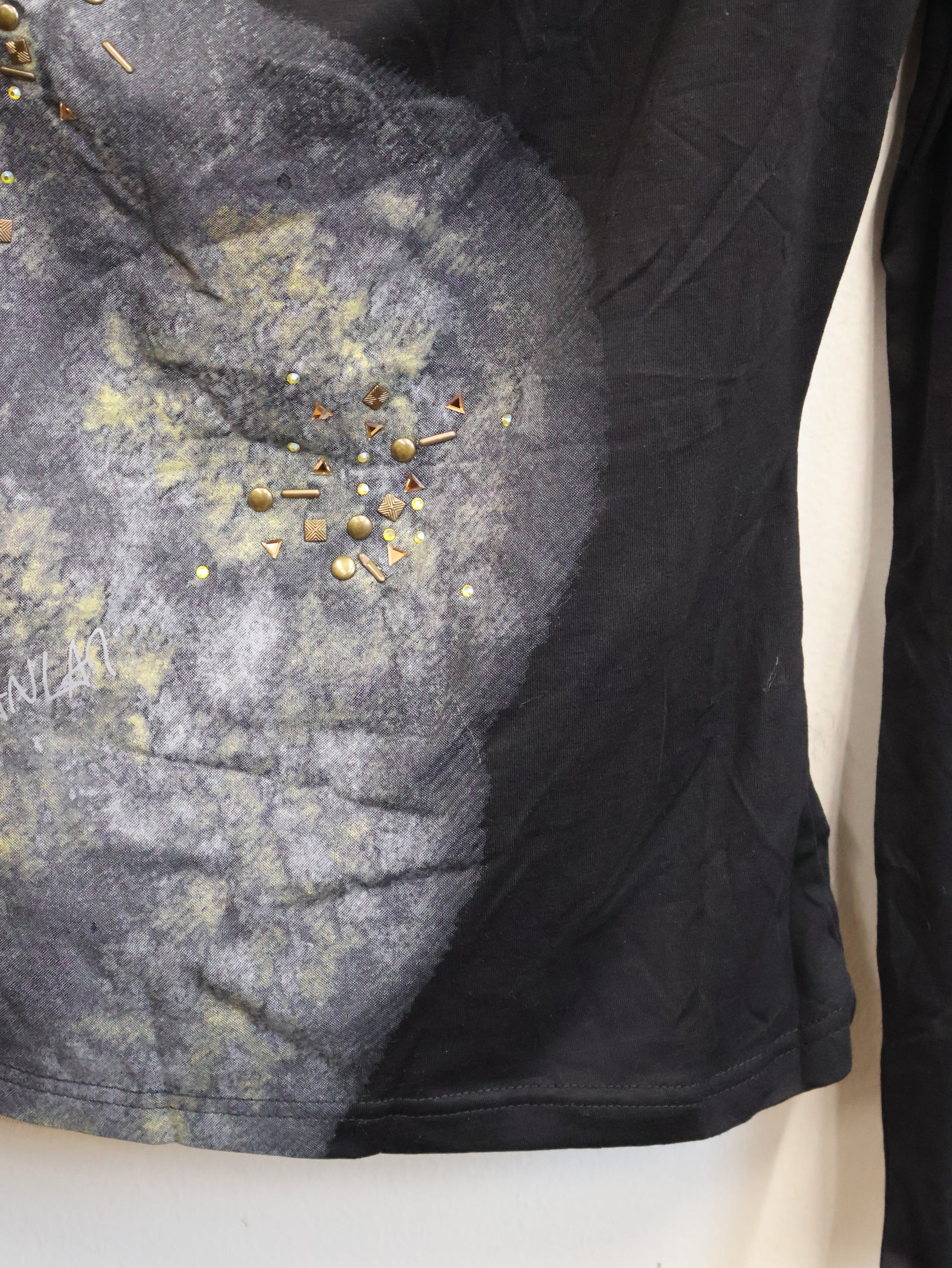 アートのようなスモークプリントとスタッズが重なり、ただのトップスでは終わらない存在感を放つ一着。