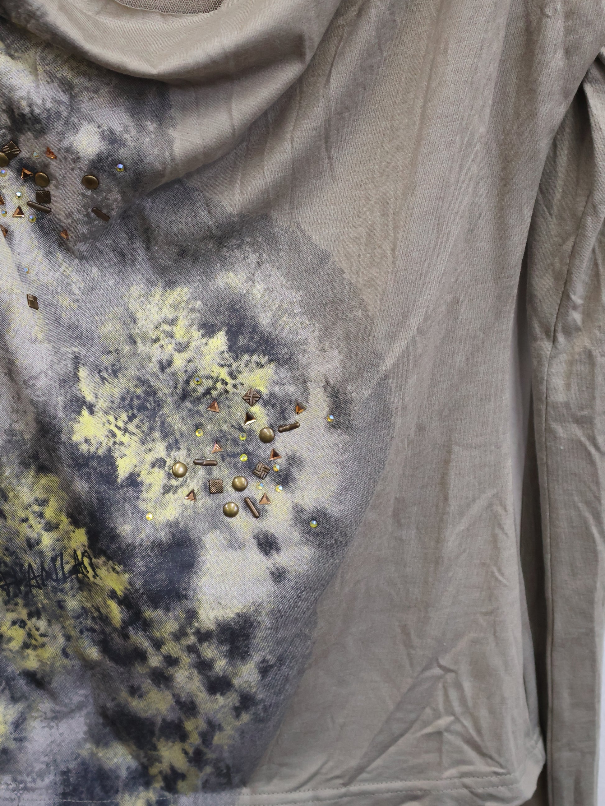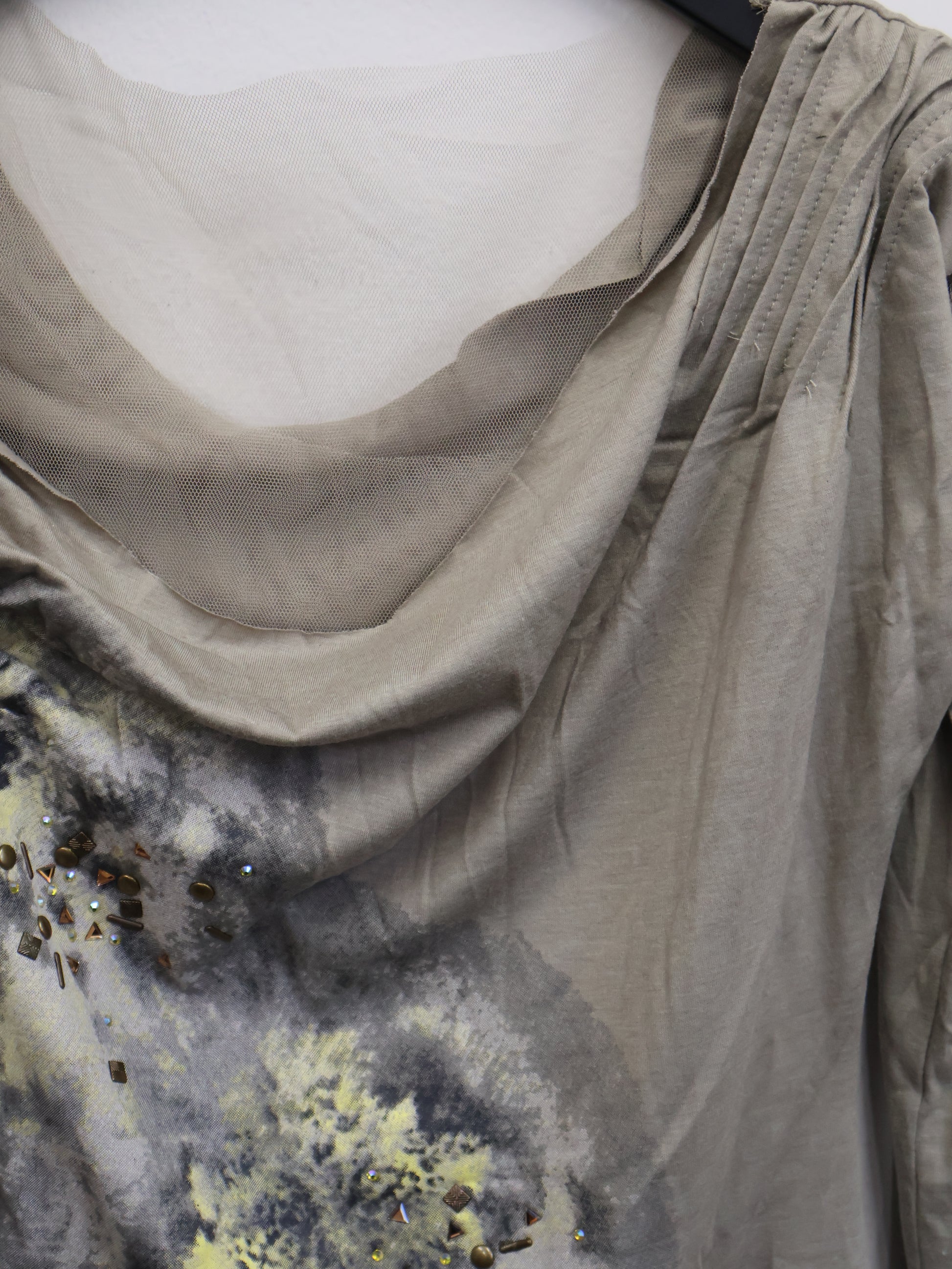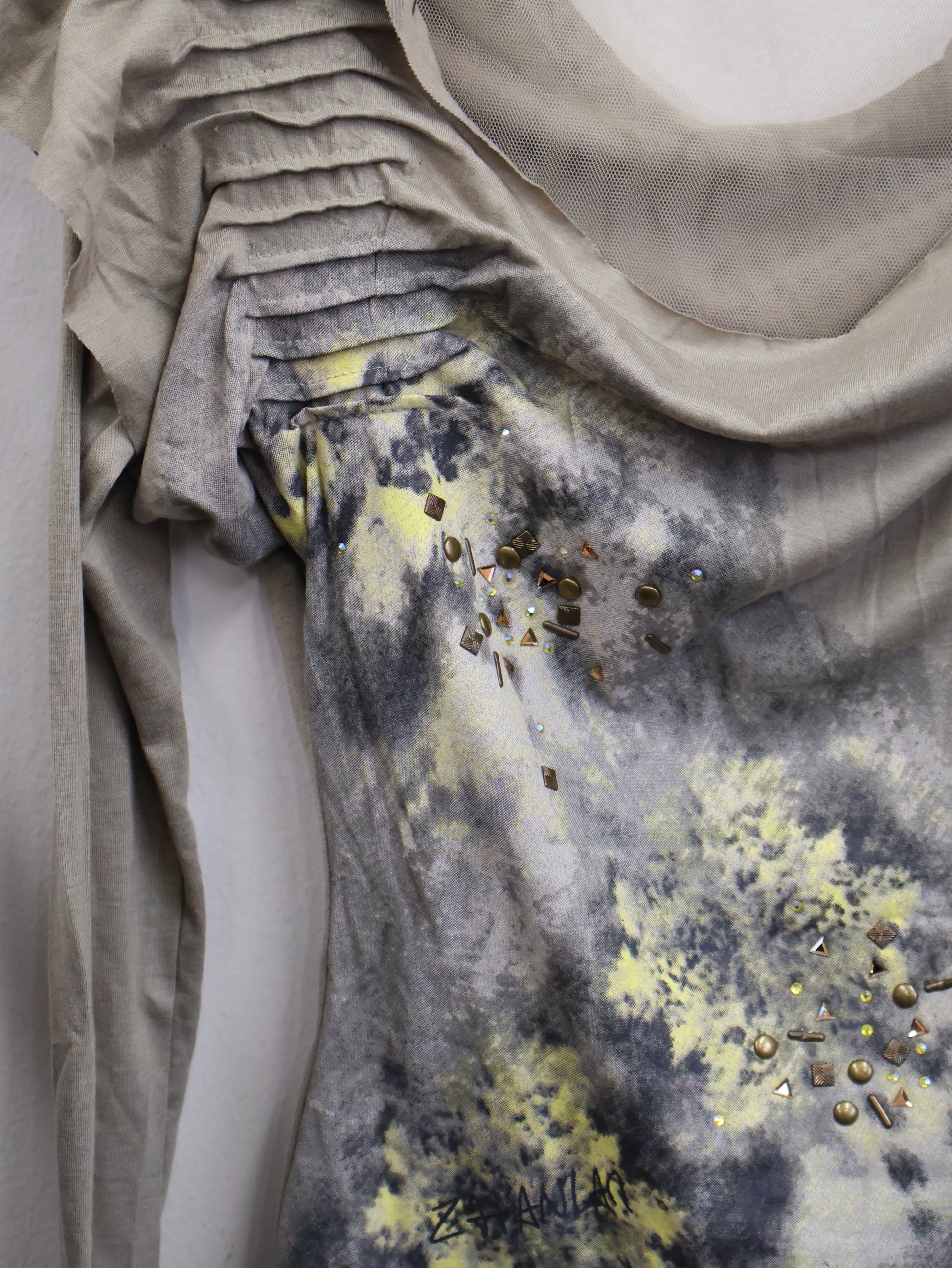 アートのようなスモークプリントとスタッズが重なり、ただのトップスでは終わらない存在感を放つ一着。