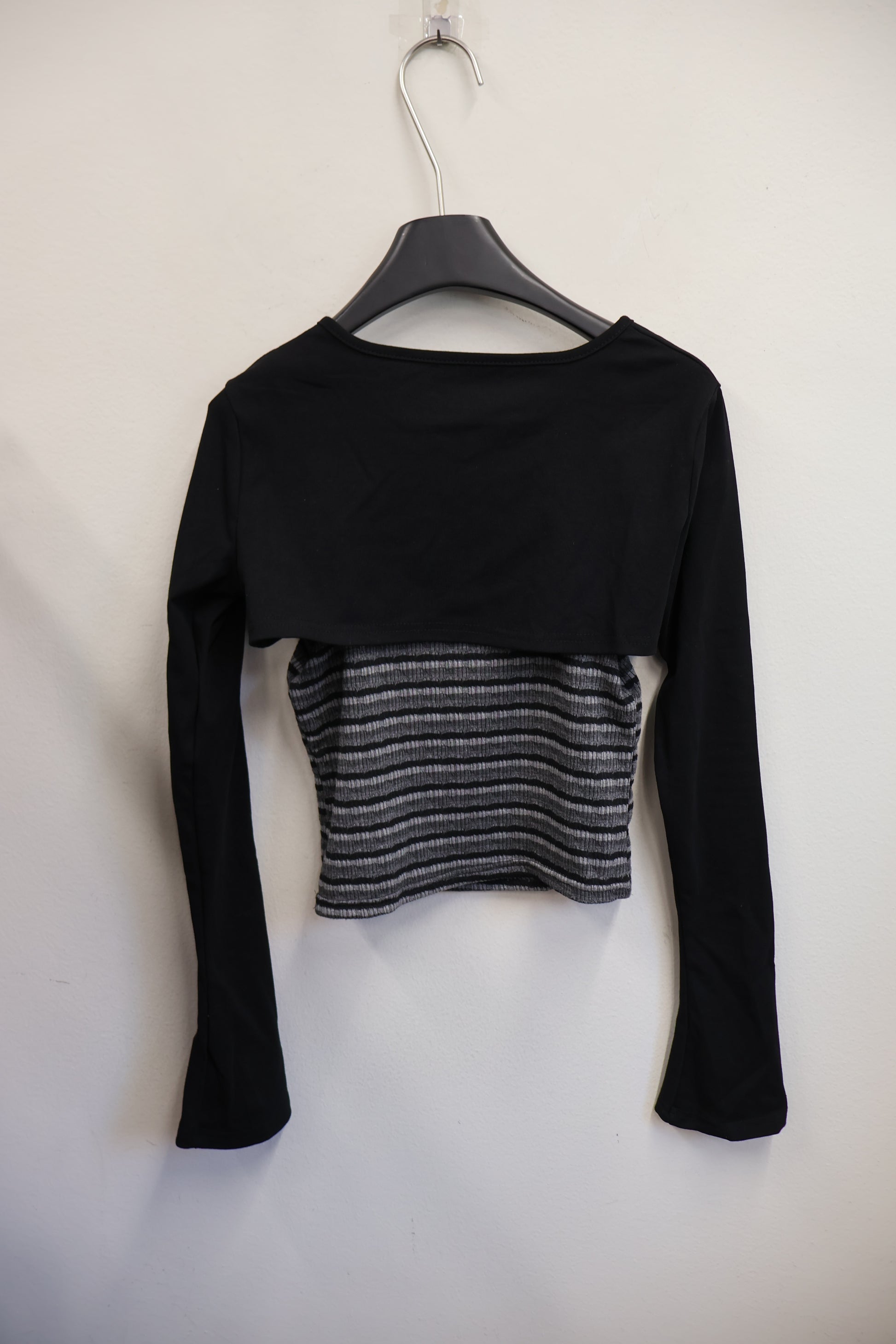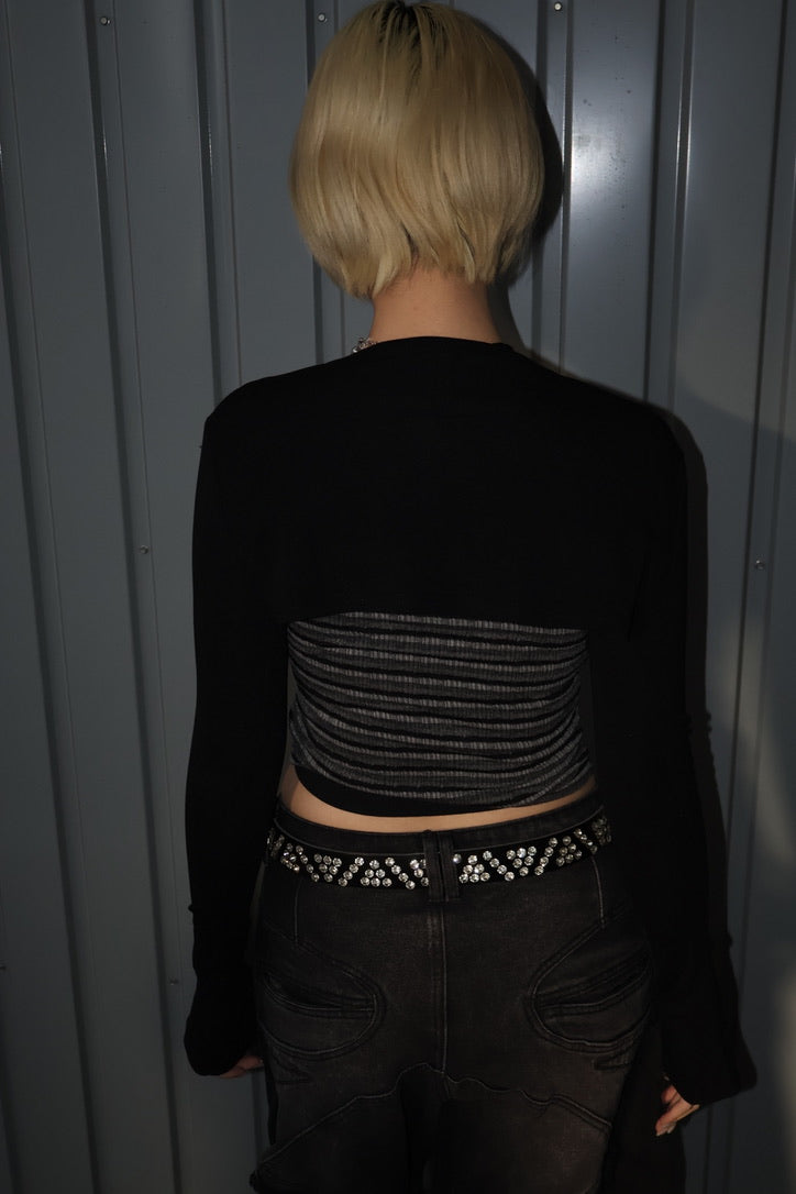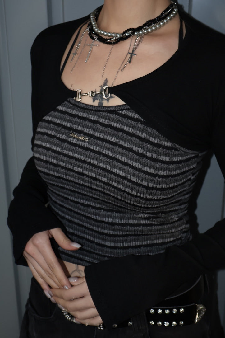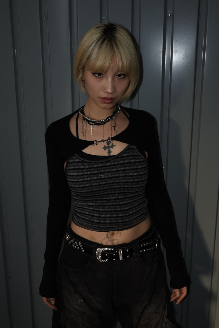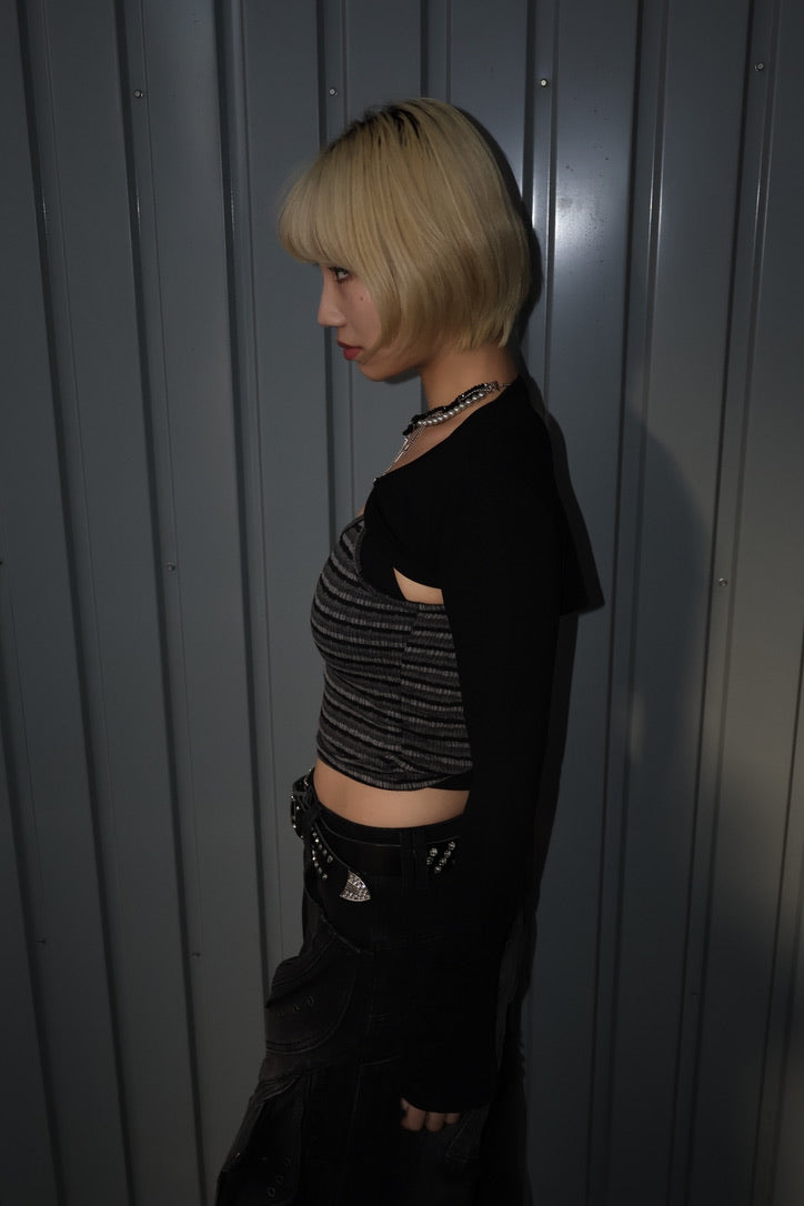 コンパクトなクロップド丈のリブトップに、ボレロ風レイヤードが一体化したデザイン。