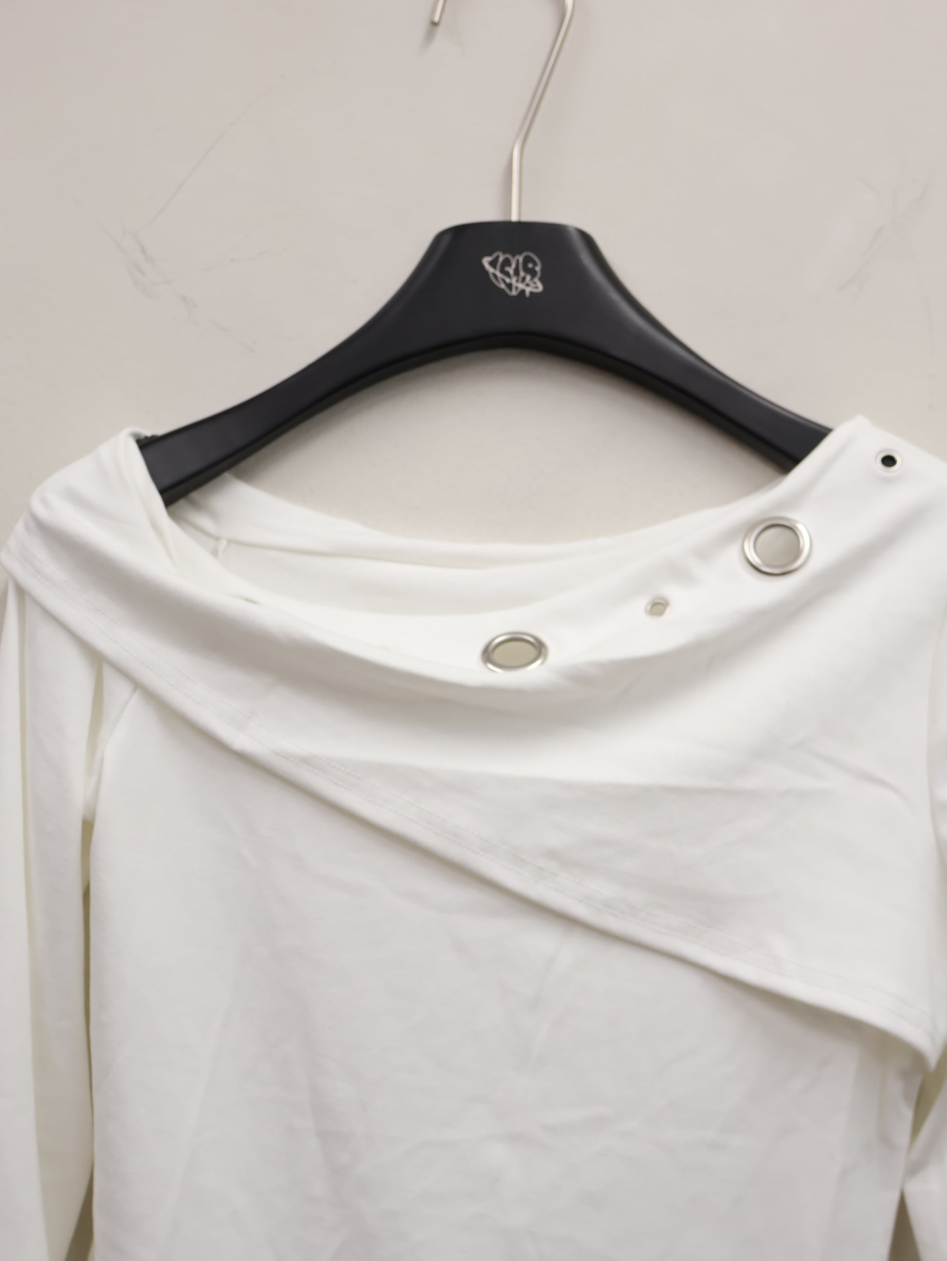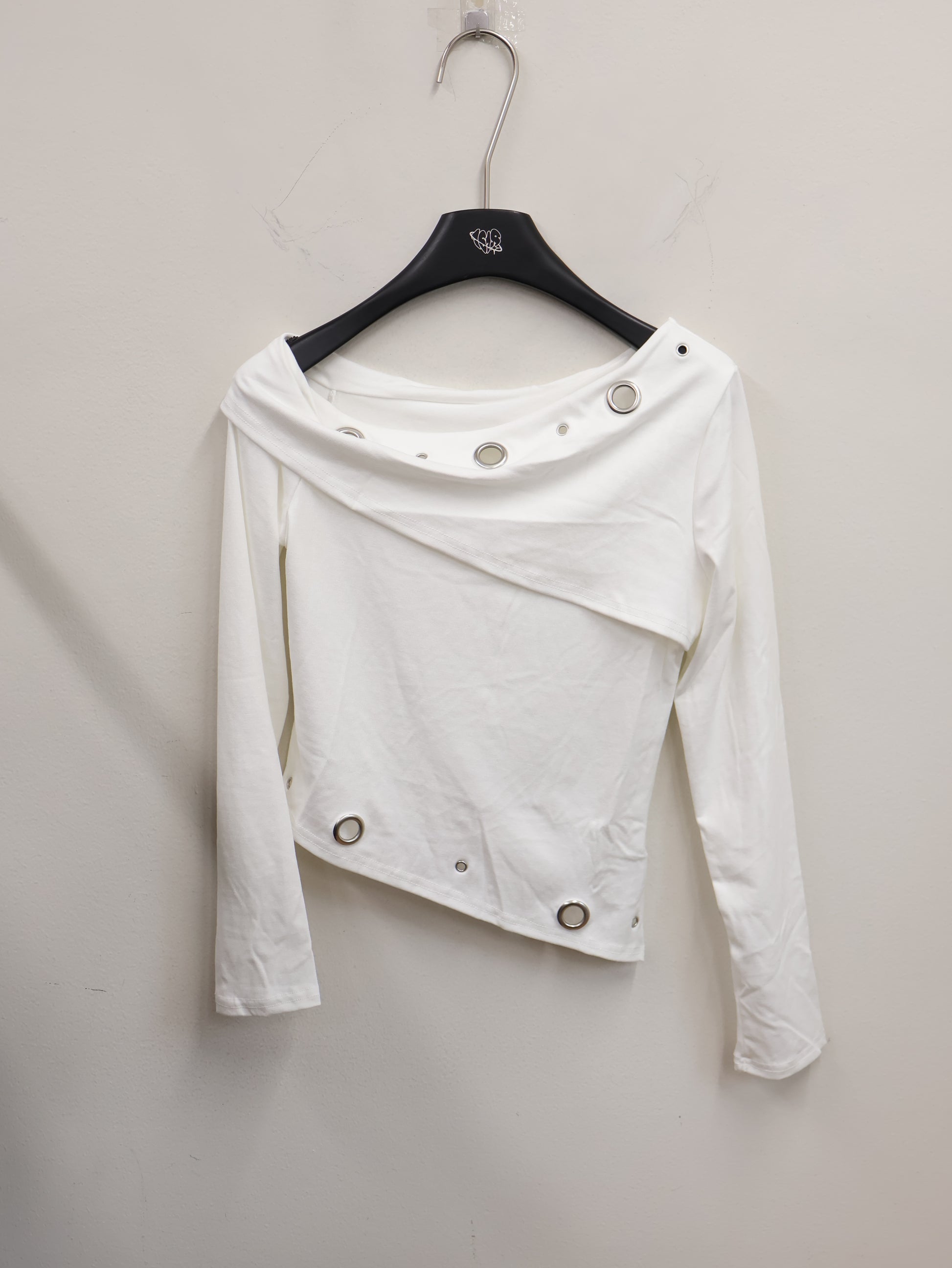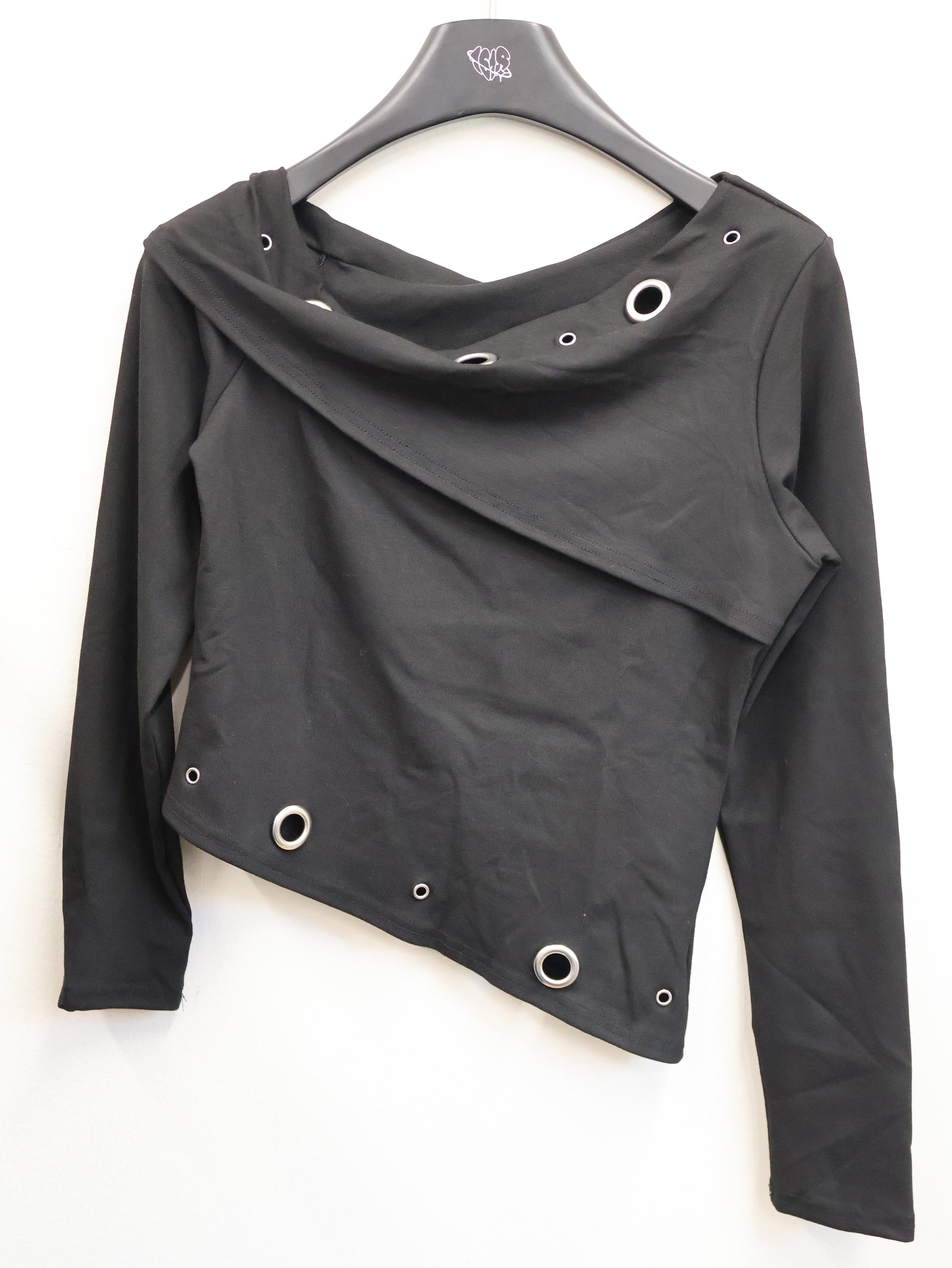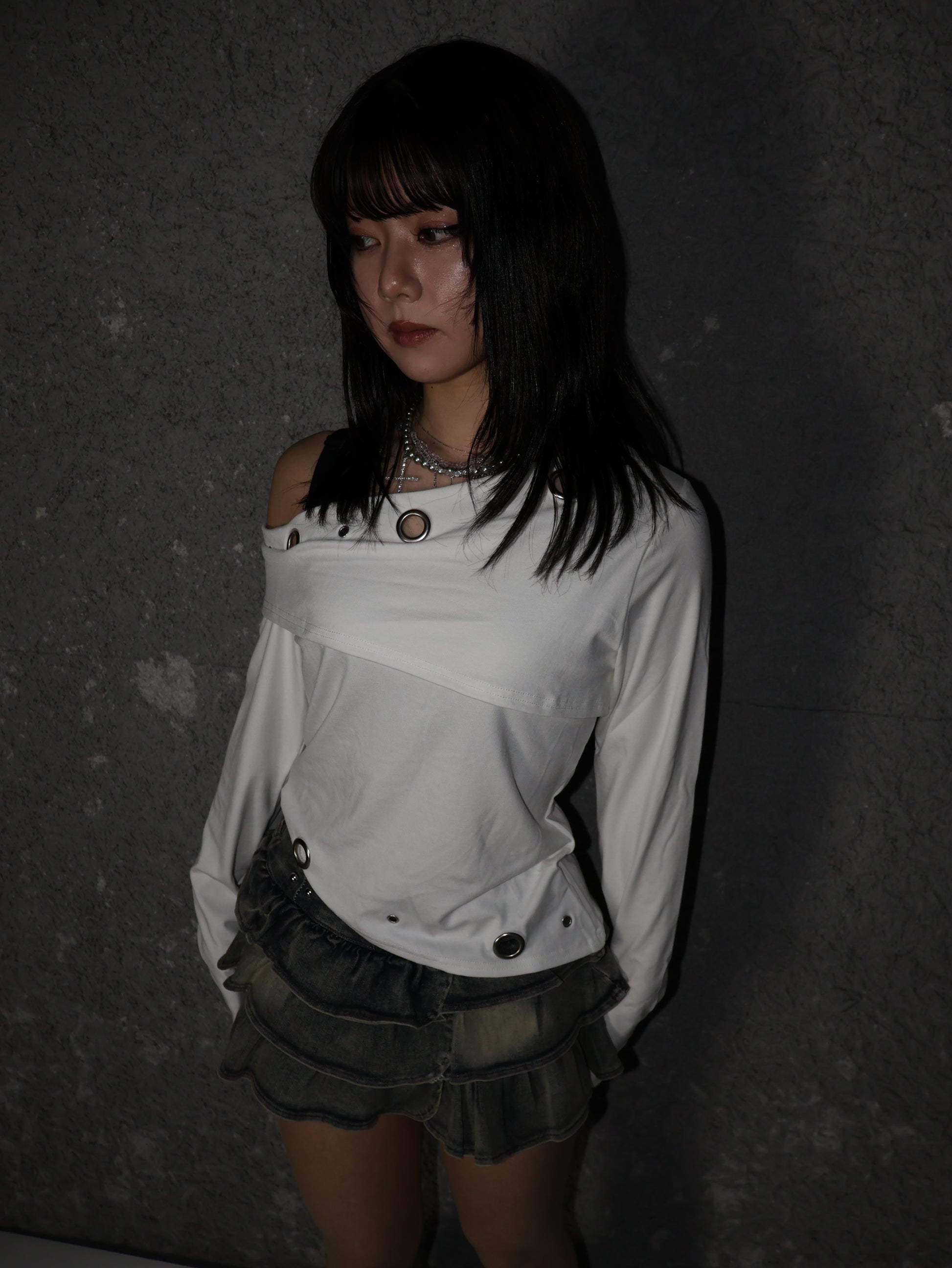 アシンメトリーに重なるデザインとメタルリングディテールが印象的な、Y2Kムードのロングスリーブトップス。