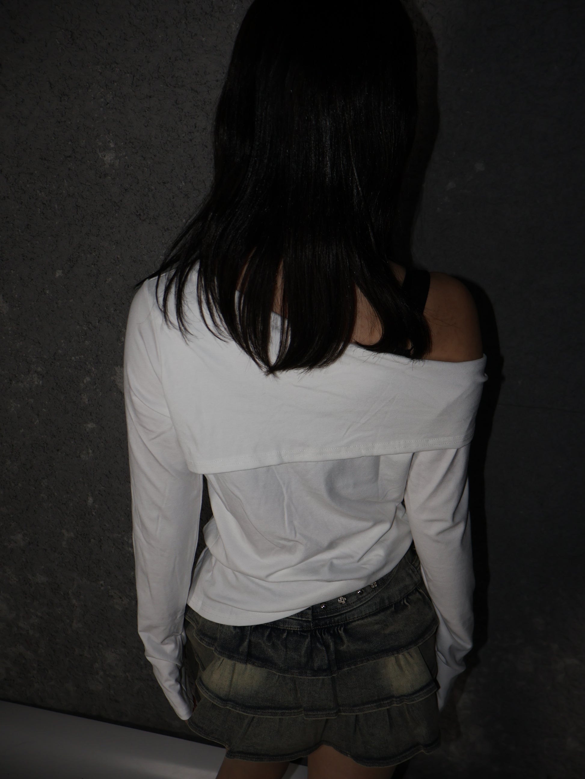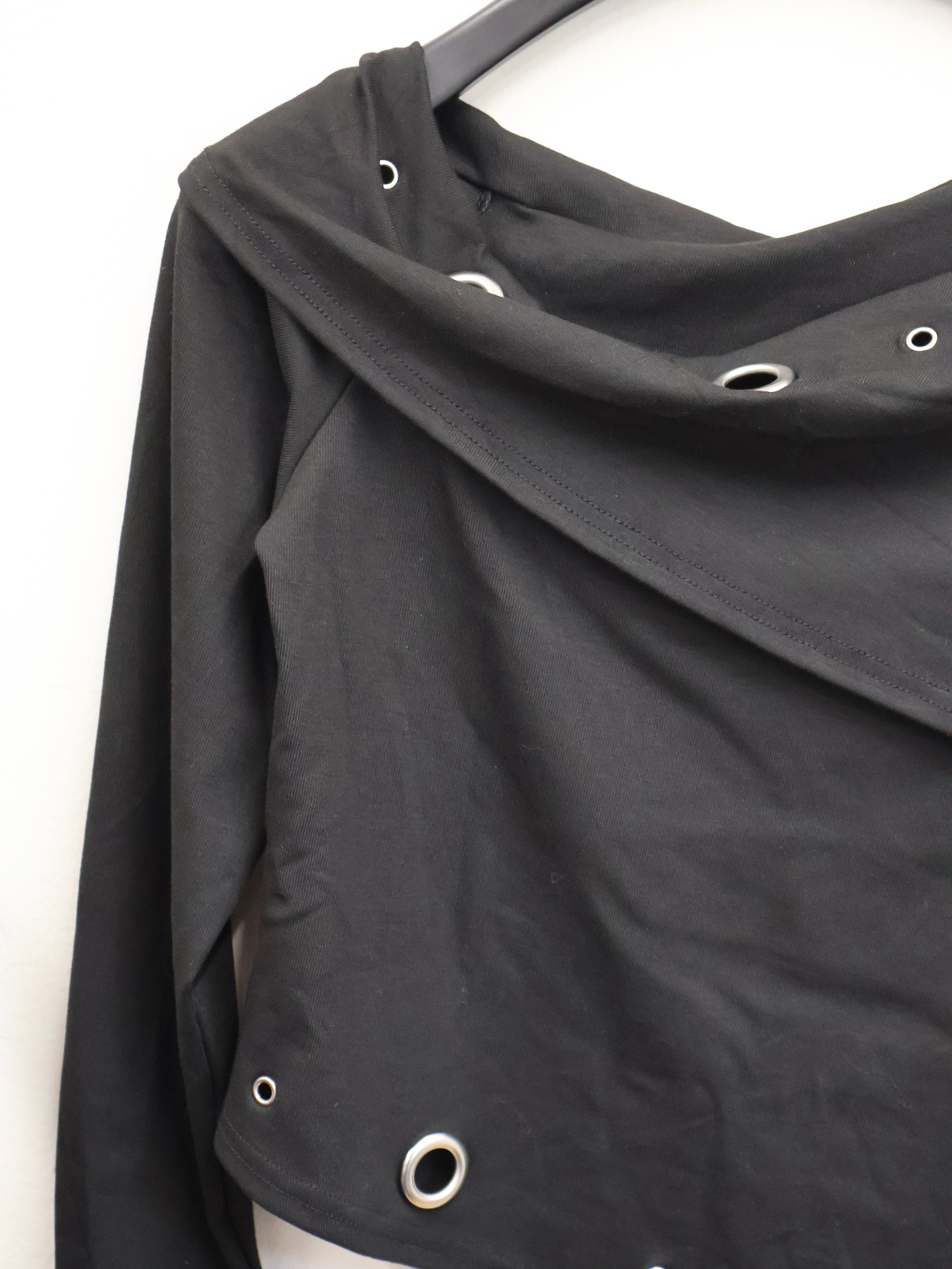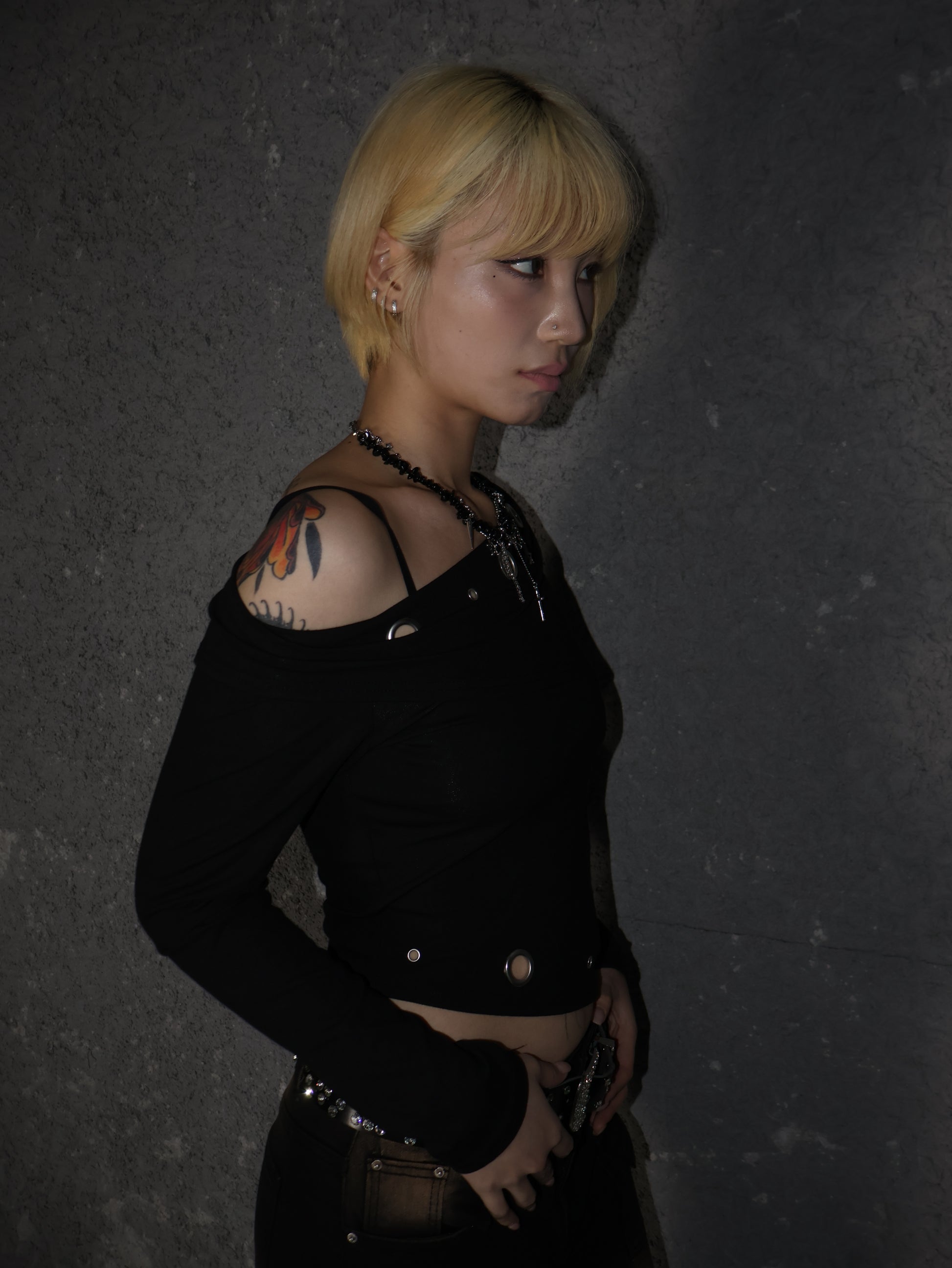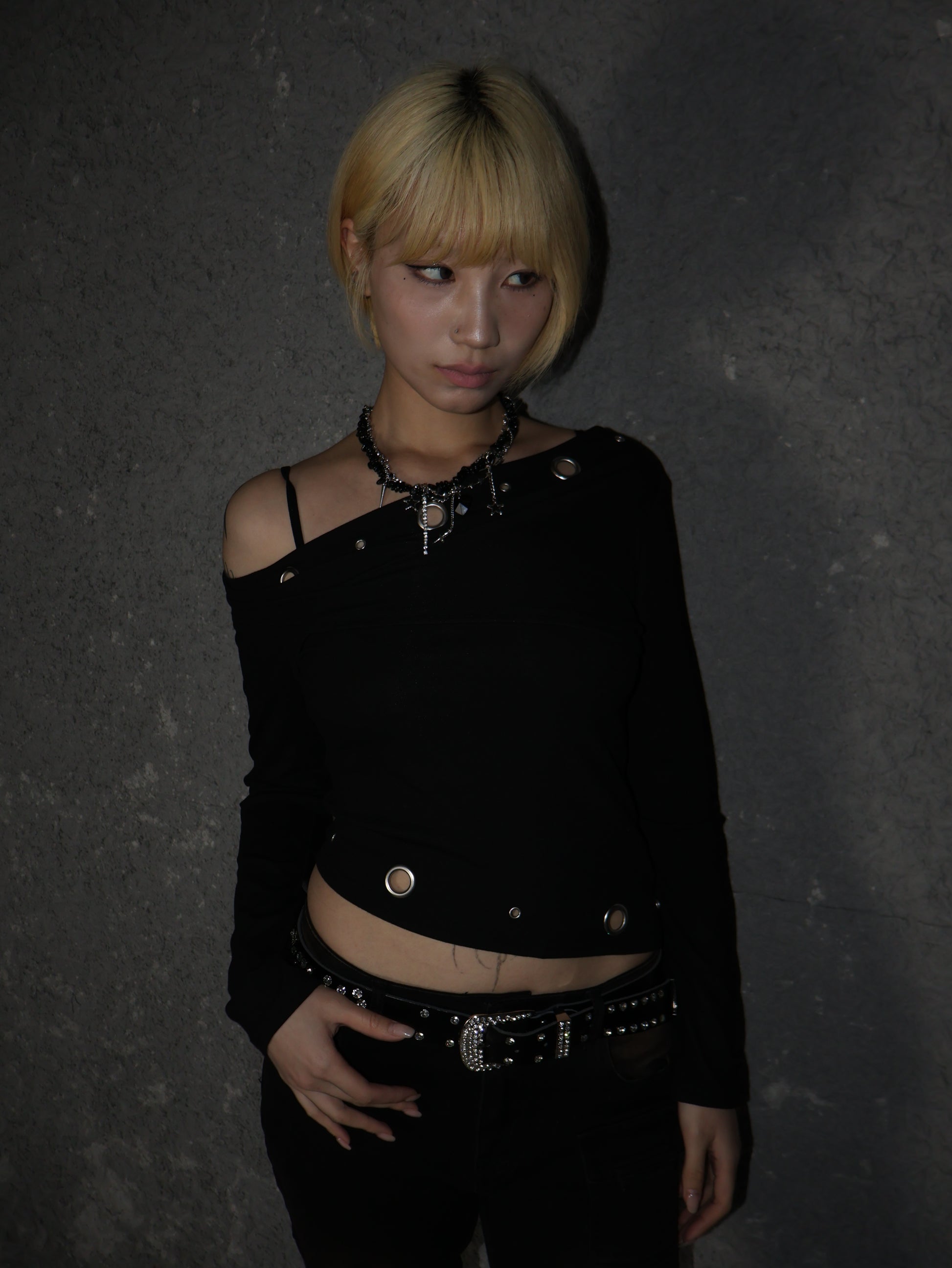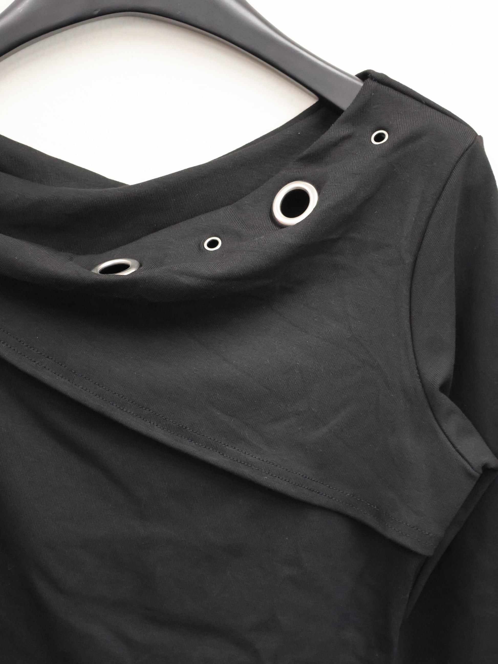 アシンメトリーに重なるデザインとメタルリングディテールが印象的な、Y2Kムードのロングスリーブトップス。