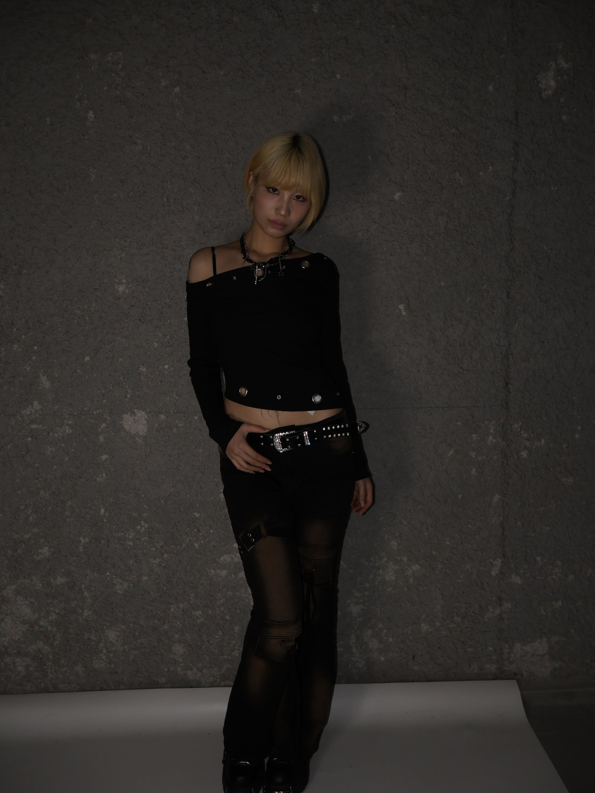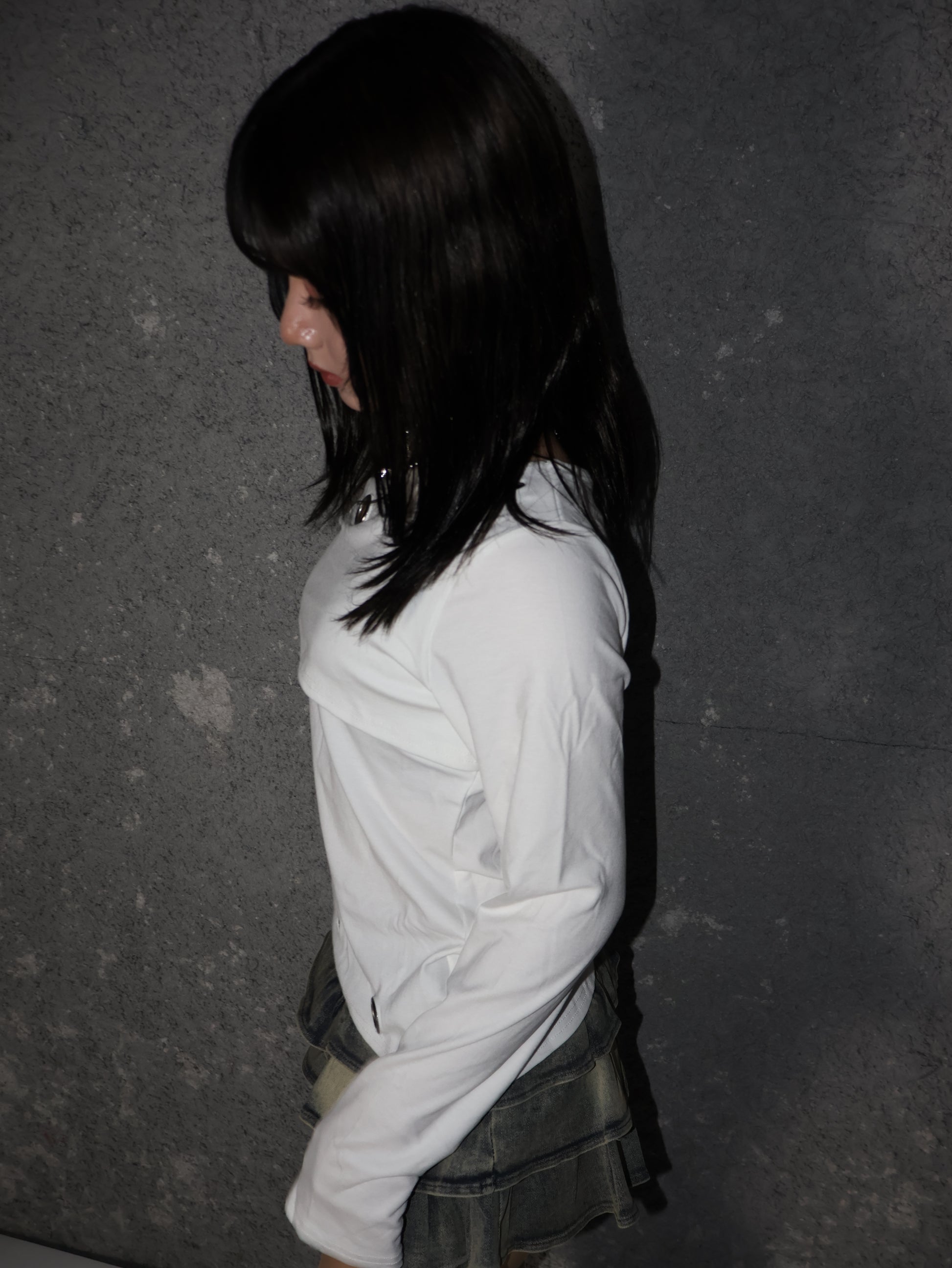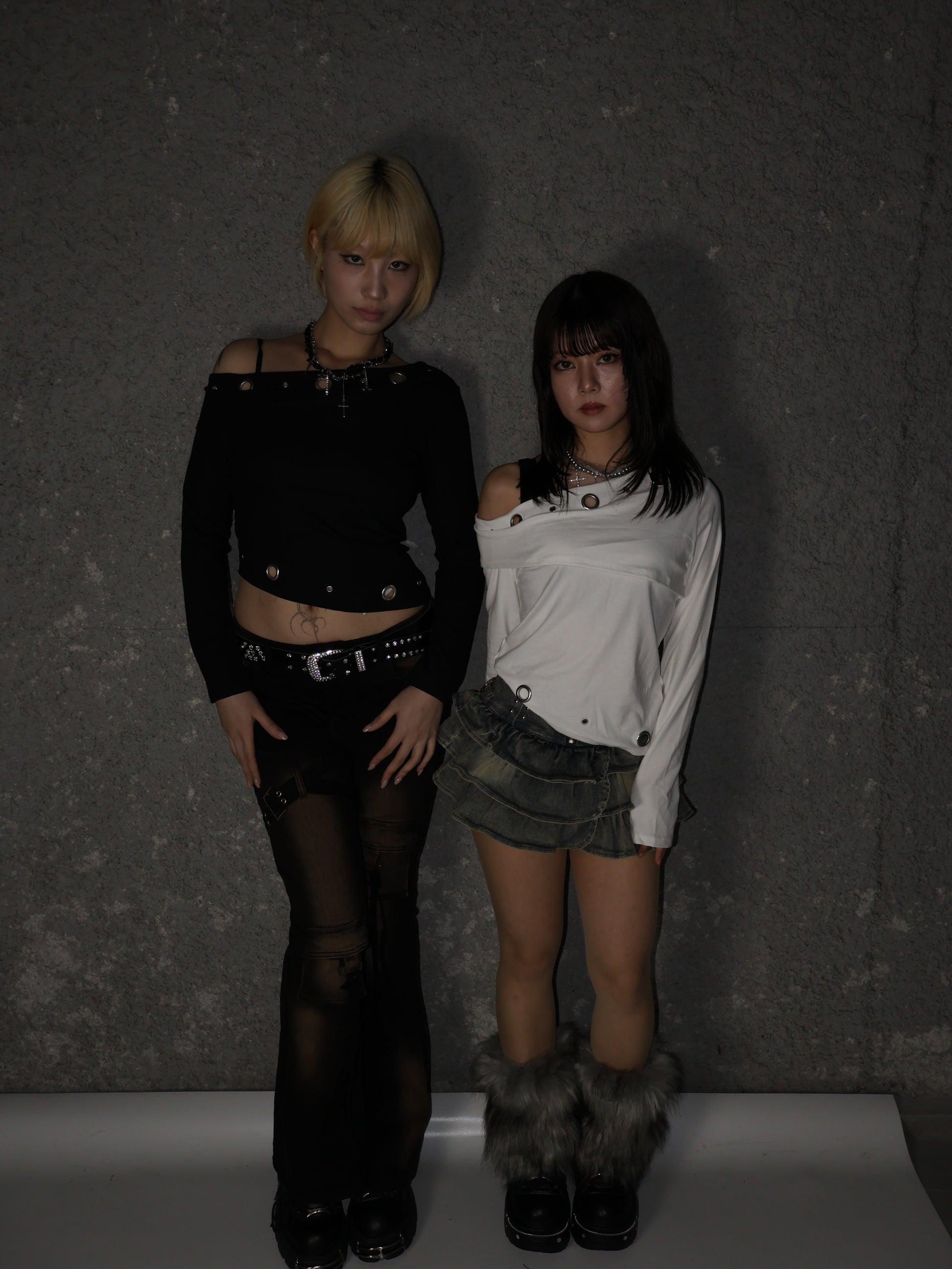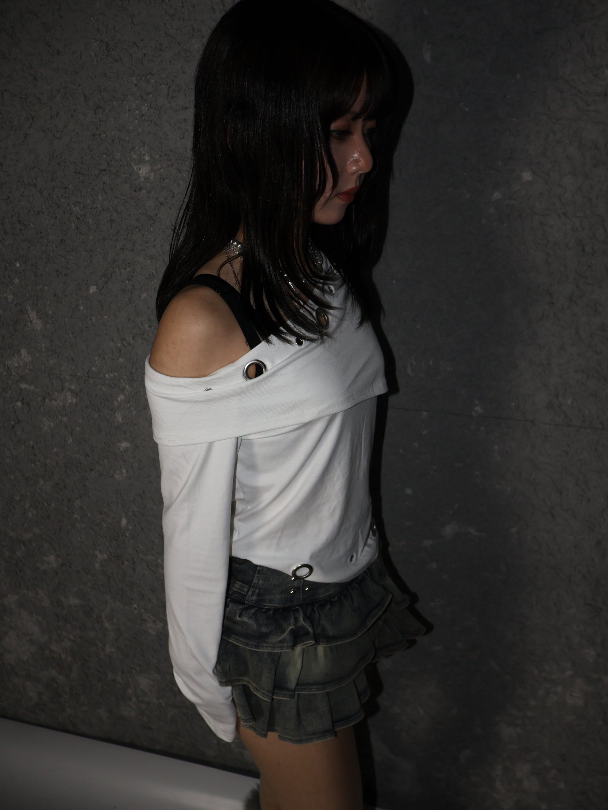 アシンメトリーに重なるデザインとメタルリングディテールが印象的な、Y2Kムードのロングスリーブトップス。
