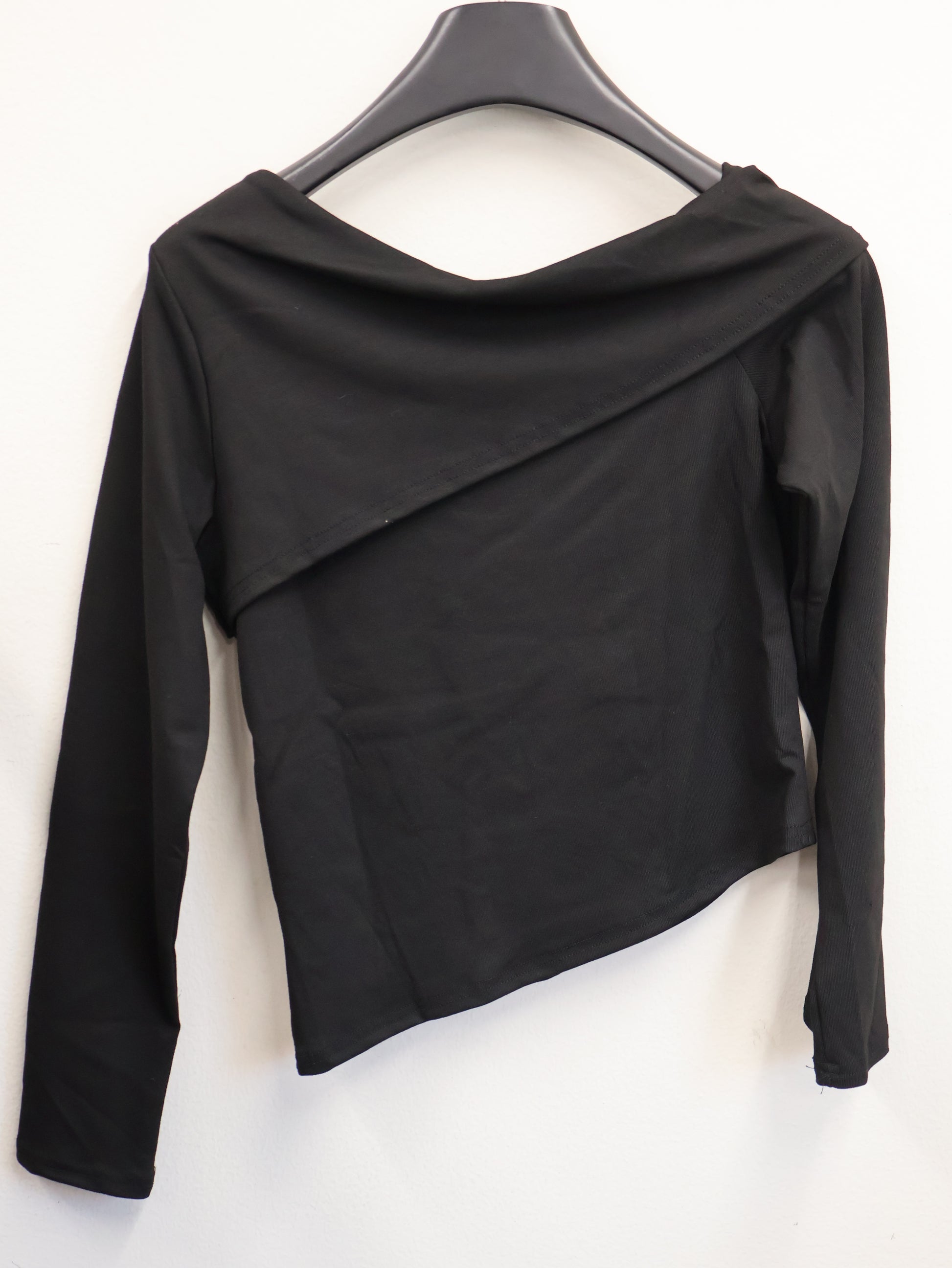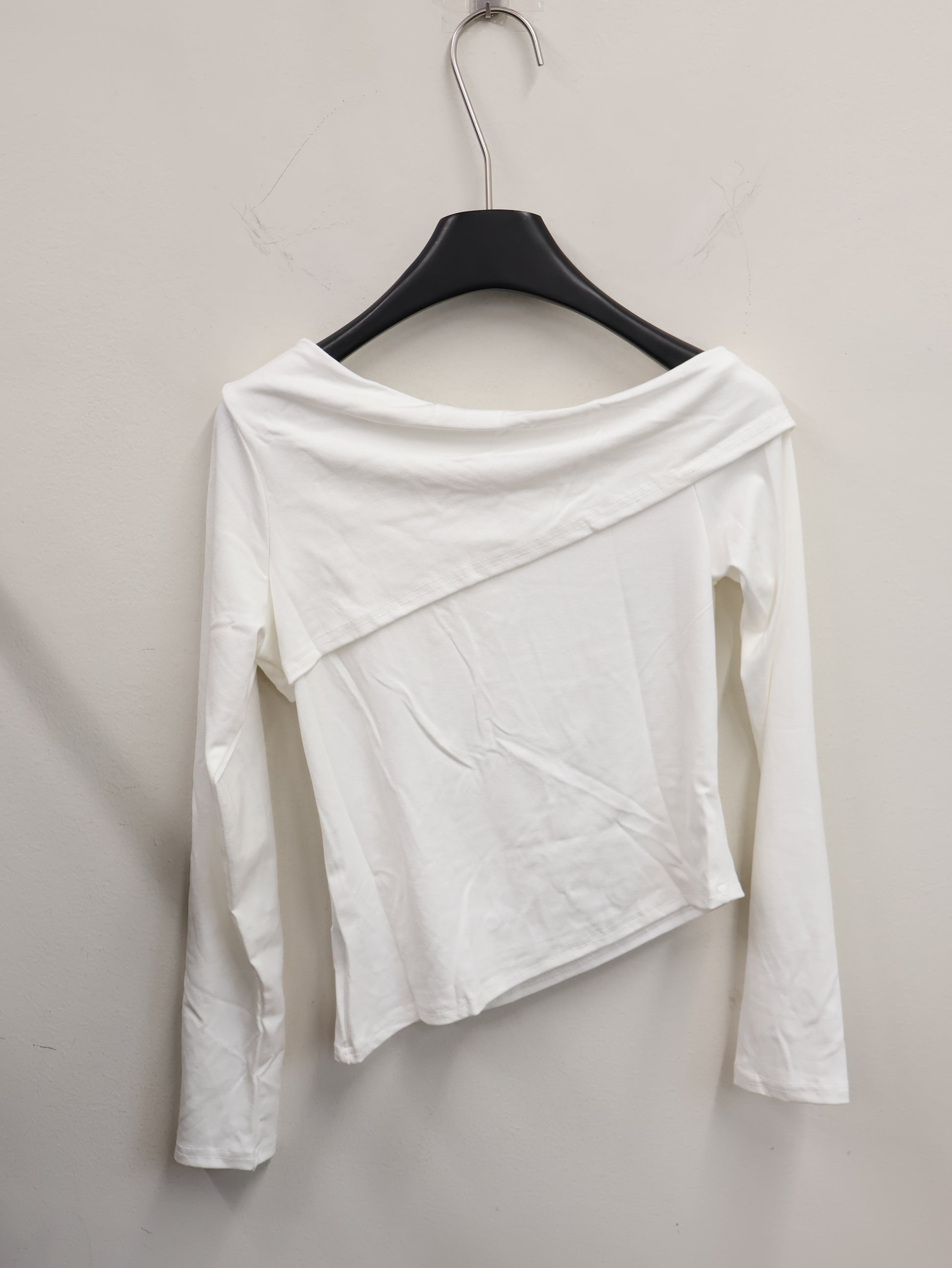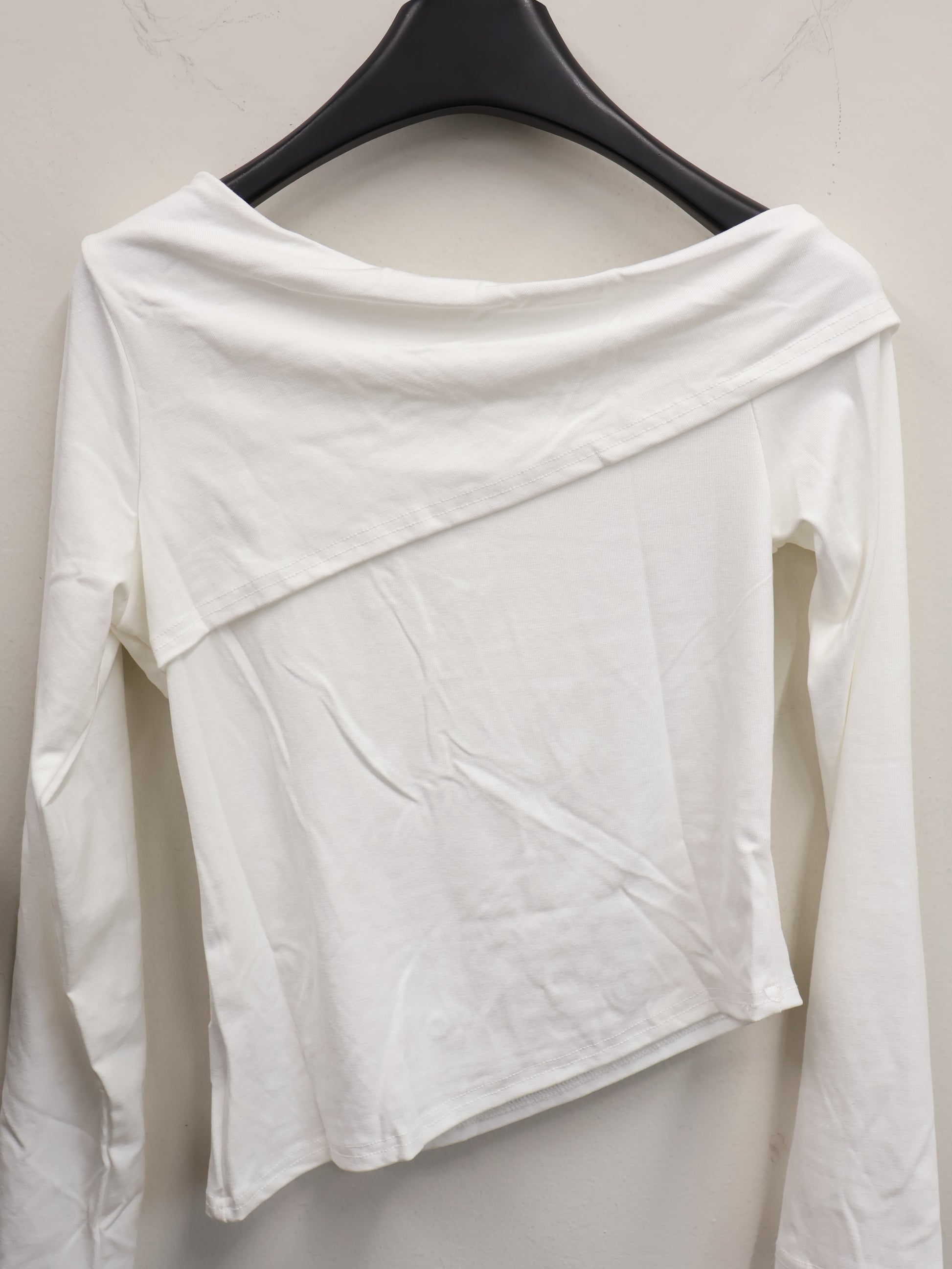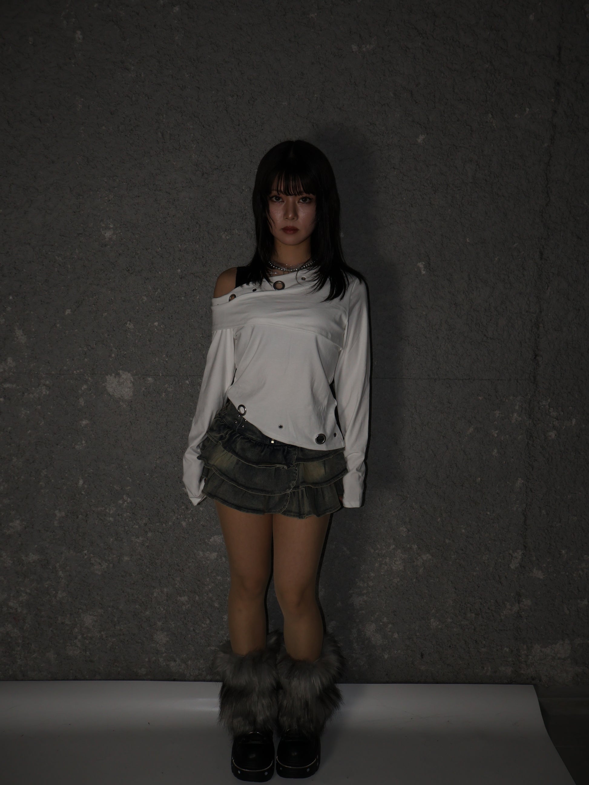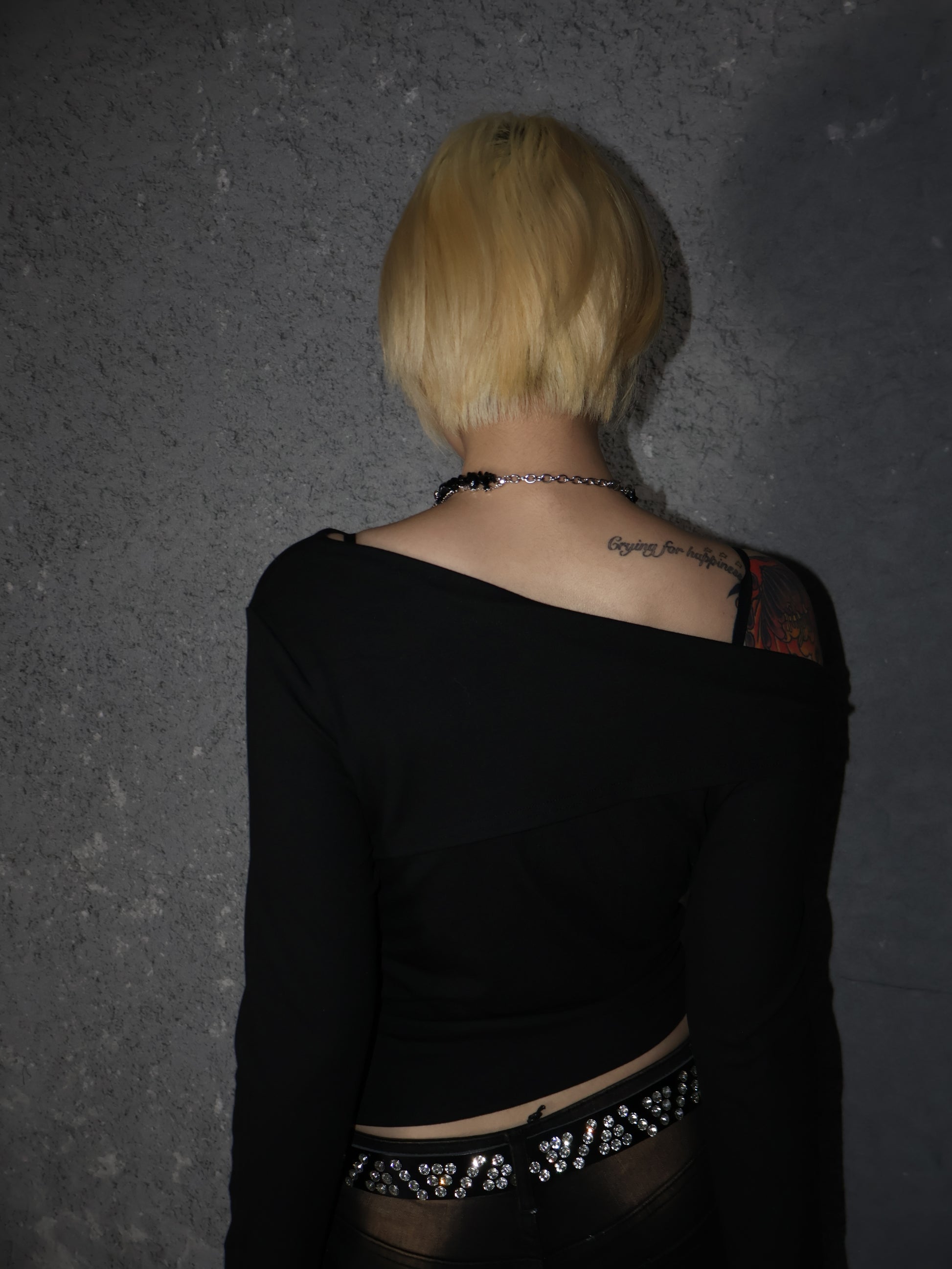 アシンメトリーに重なるデザインとメタルリングディテールが印象的な、Y2Kムードのロングスリーブトップス。