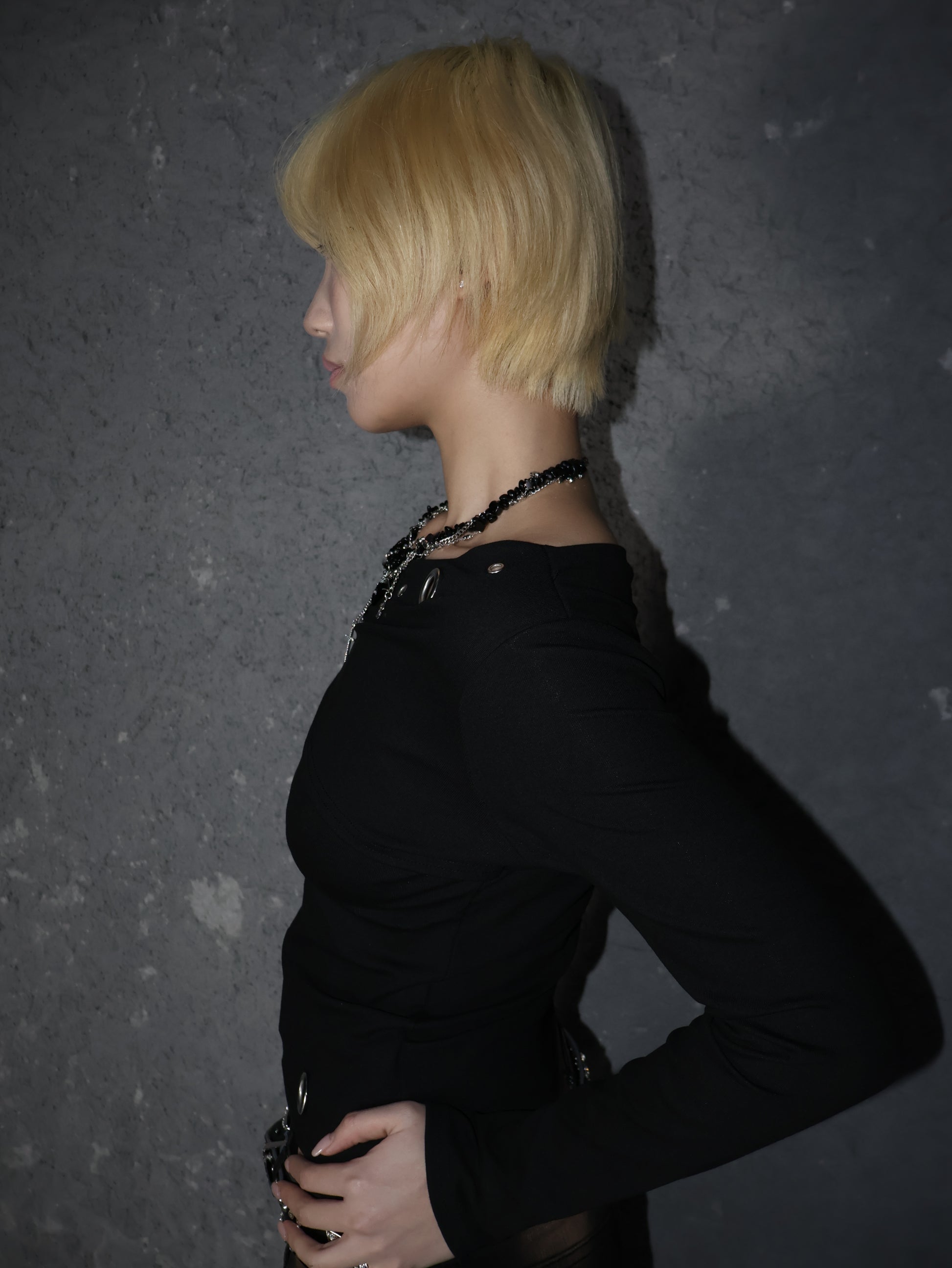 シンプルなシルエットながら、リング装飾と斜めに重なるレイヤーデザインが視線を引く主役トップスです。