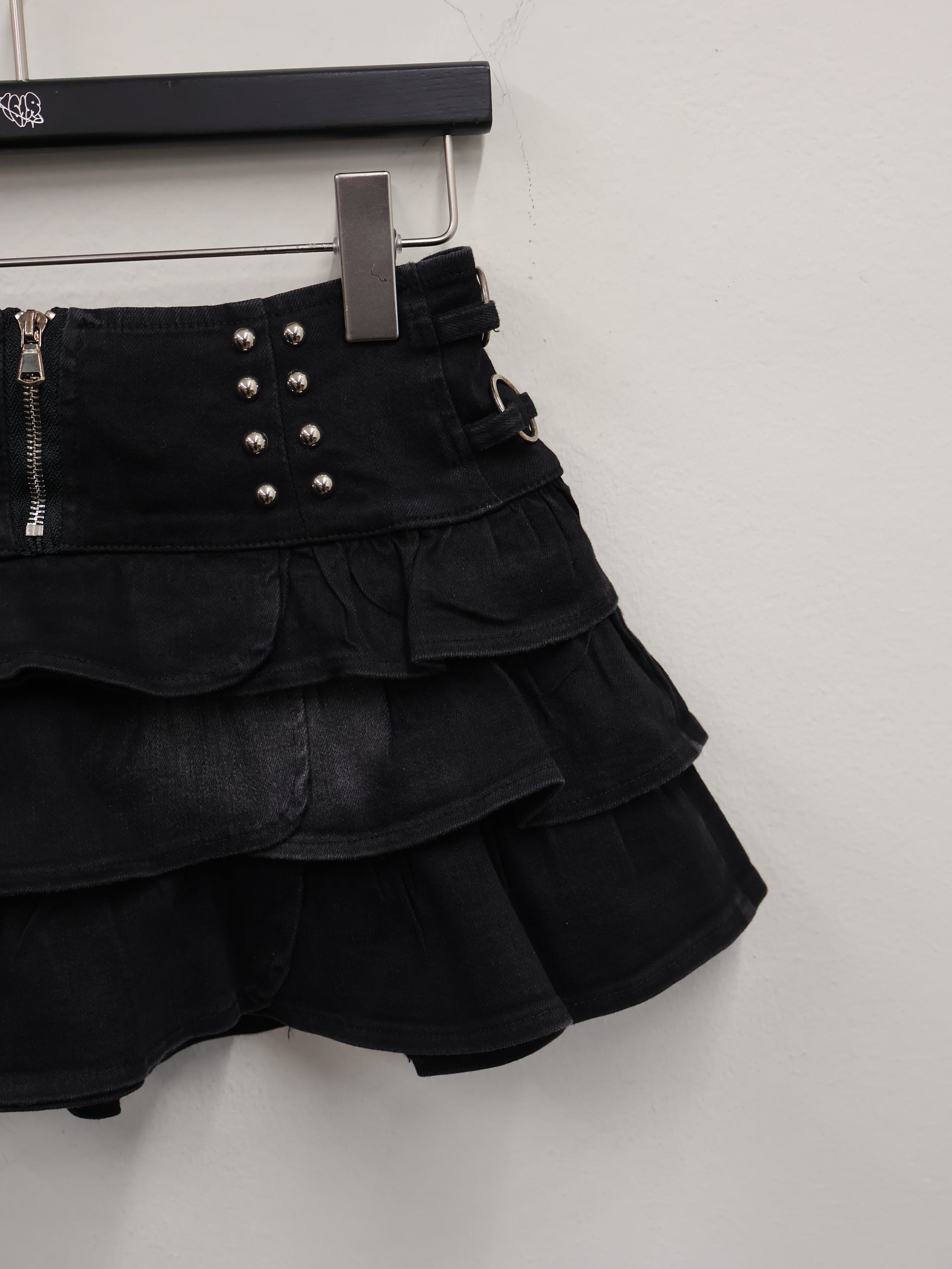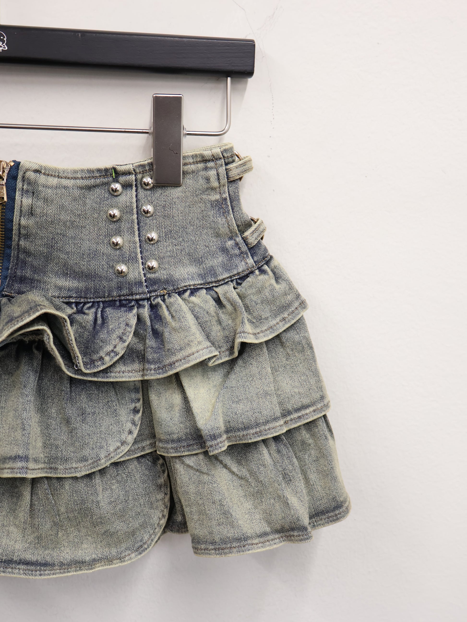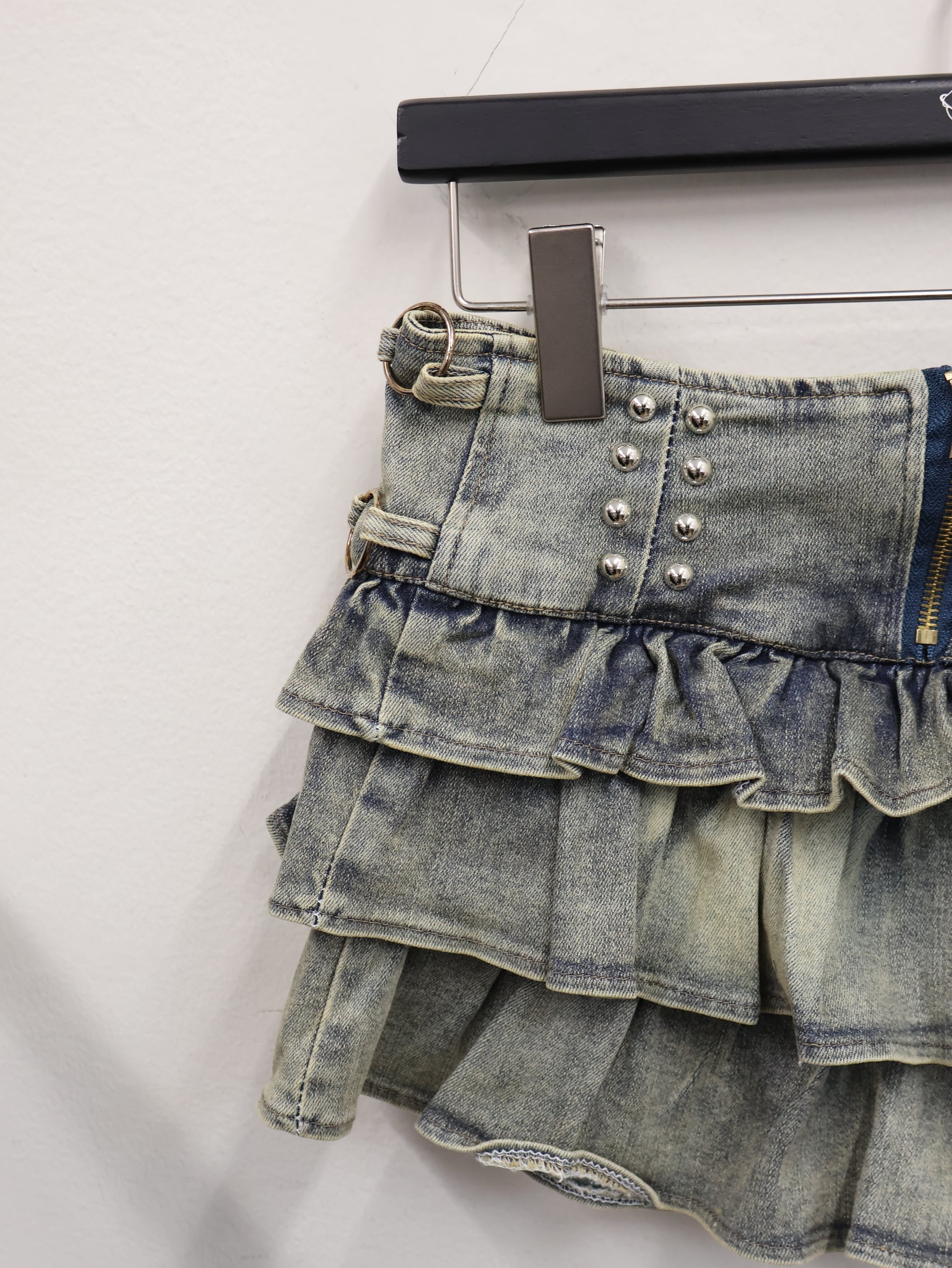 ウエスト部分に施されたスタッズ装飾と立体フリルのレイヤーシルエットが、履くだけで海外ガール感を作るデザインです。