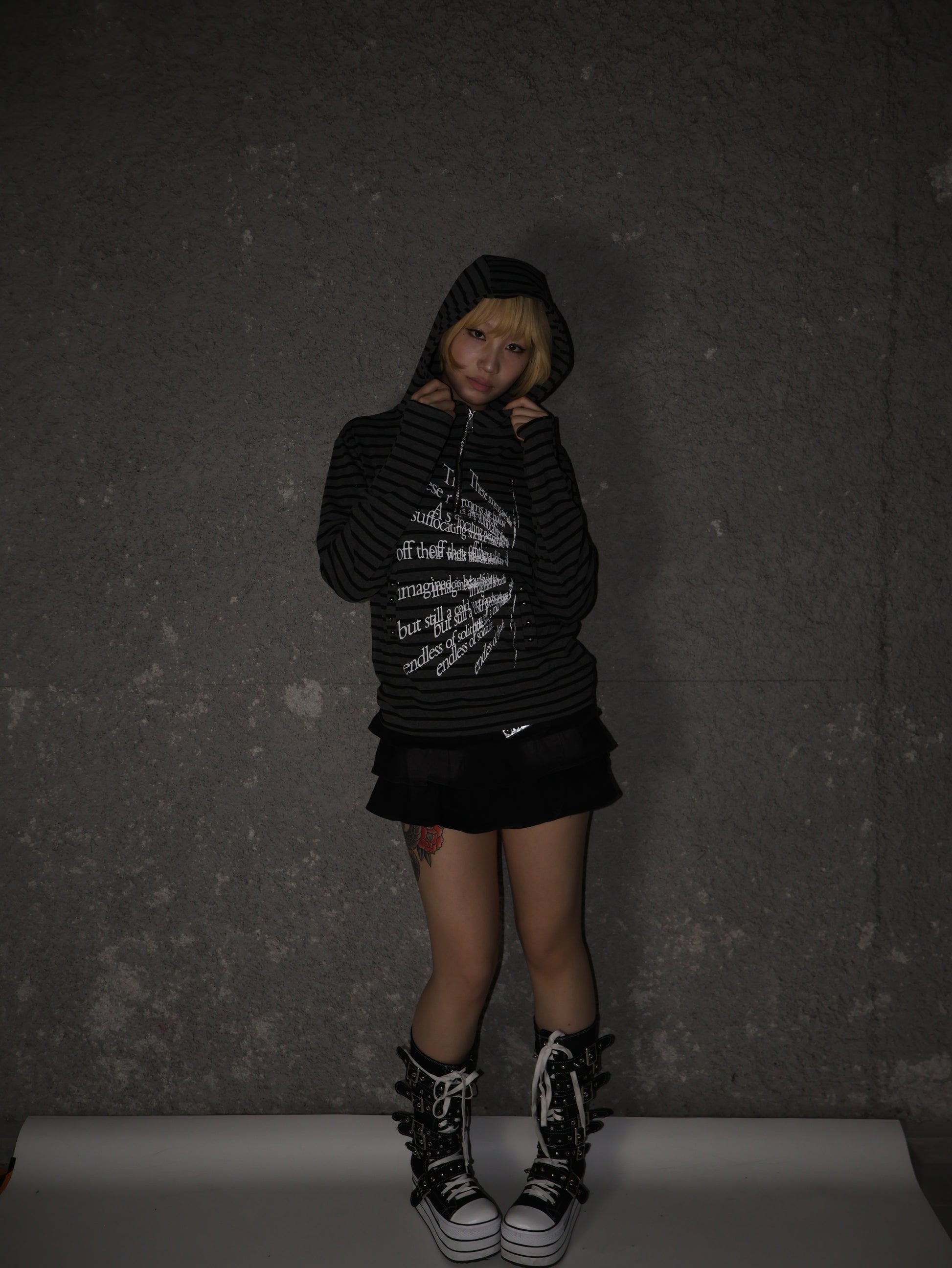 ・オーバーパーカー+厚底スニーカーでストリートスタイル